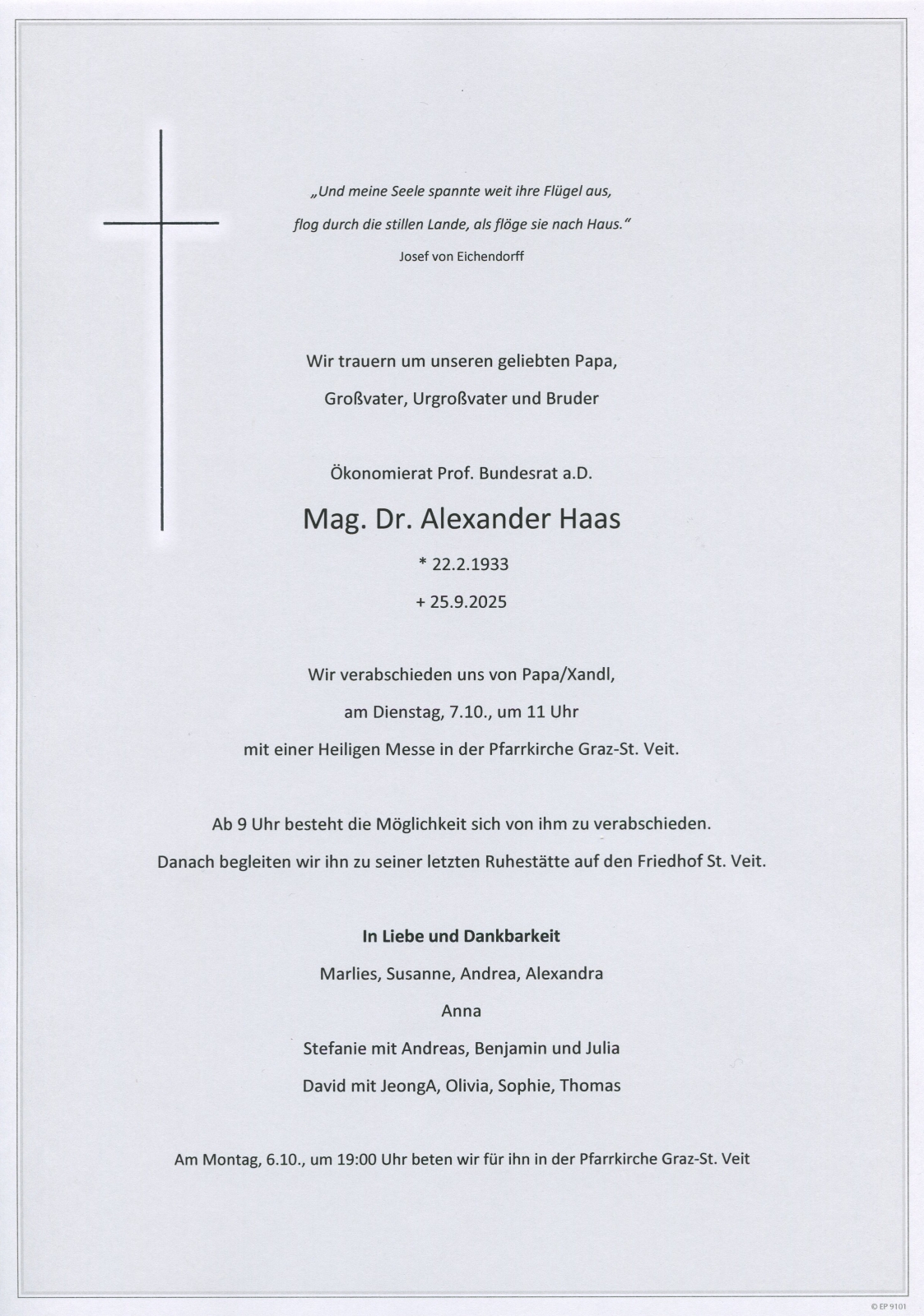 Trauerfeier am 7. Oktober 2025 um 11:00 Uhr,