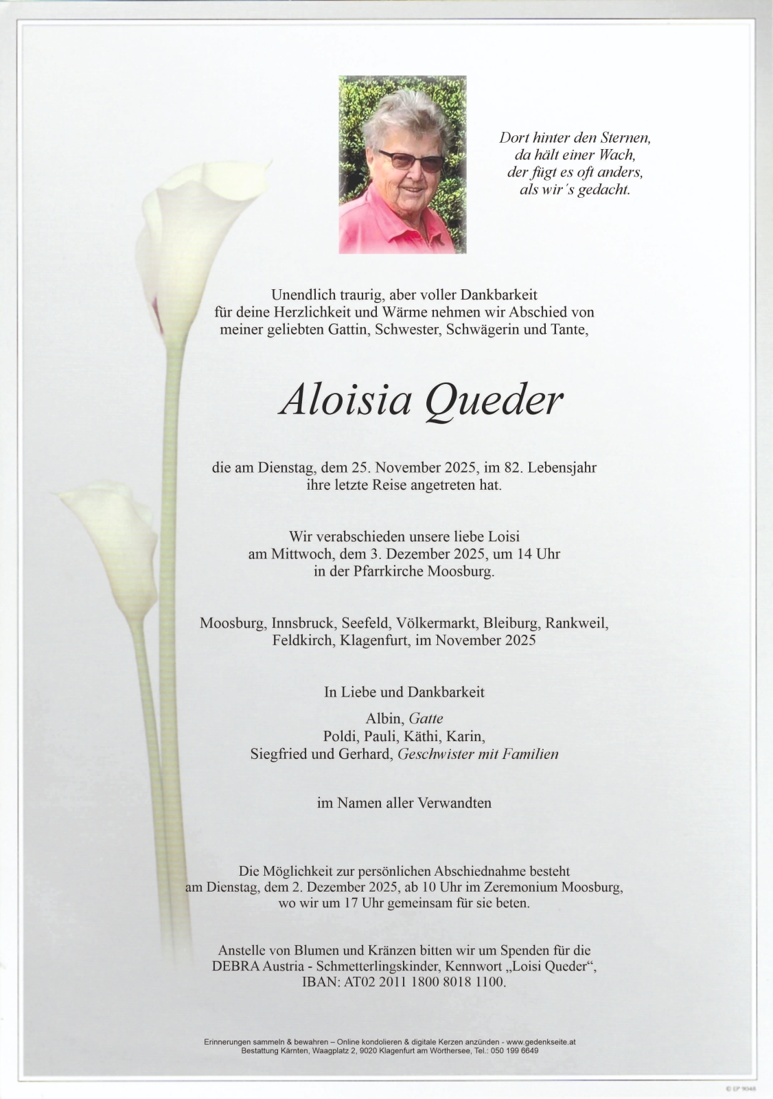 Verschicken Sie eine private Nachricht an die Familie & Hinterbliebenen von Aloisia Queder. Diese wird nicht veröffentlicht, sondern landet direkt im E-Mail-Postfach der Administrator:innen dieser persönlichen Gedenkseite.