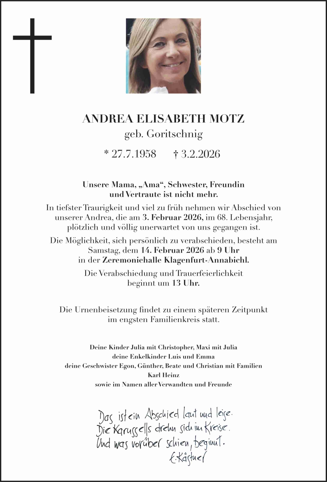 Verschicken Sie eine private Nachricht an die Familie & Hinterbliebenen von Andrea Elisabeth Motz. Diese wird nicht veröffentlicht, sondern landet direkt im E-Mail-Postfach der Administrator:innen dieser persönlichen Gedenkseite.