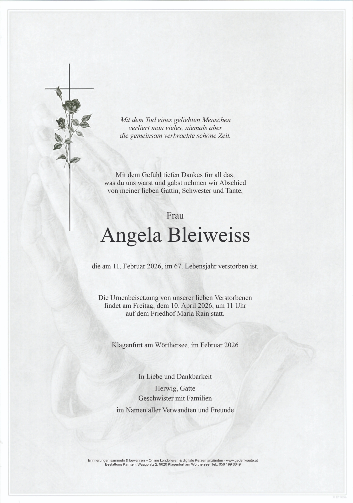 Trauerfeier am 10. April 2026 um 11:00 Uhr,