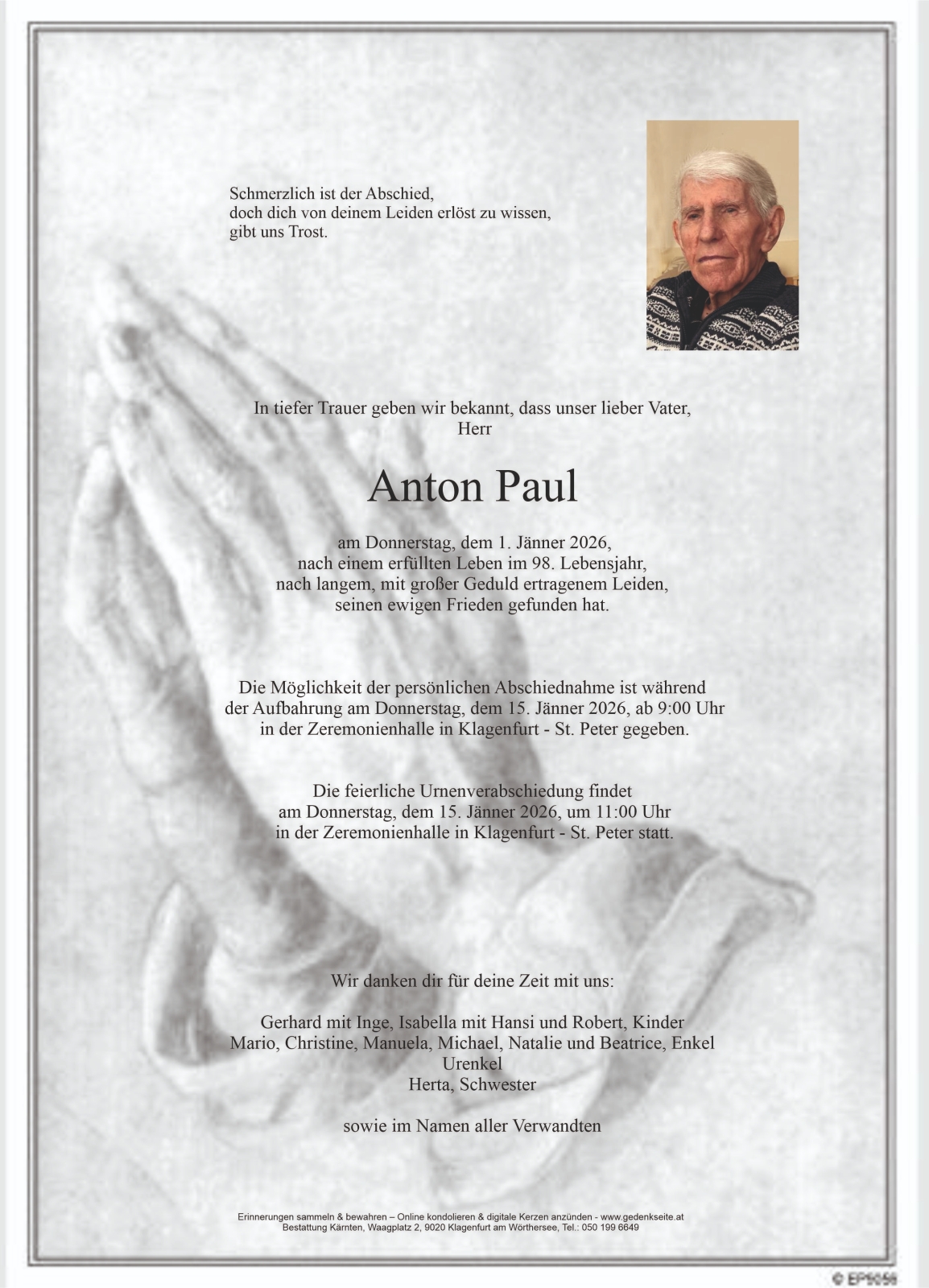 Verschicken Sie eine private Nachricht an die Familie & Hinterbliebenen von Anton Paul. Diese wird nicht veröffentlicht, sondern landet direkt im E-Mail-Postfach der Administrator:innen dieser persönlichen Gedenkseite.