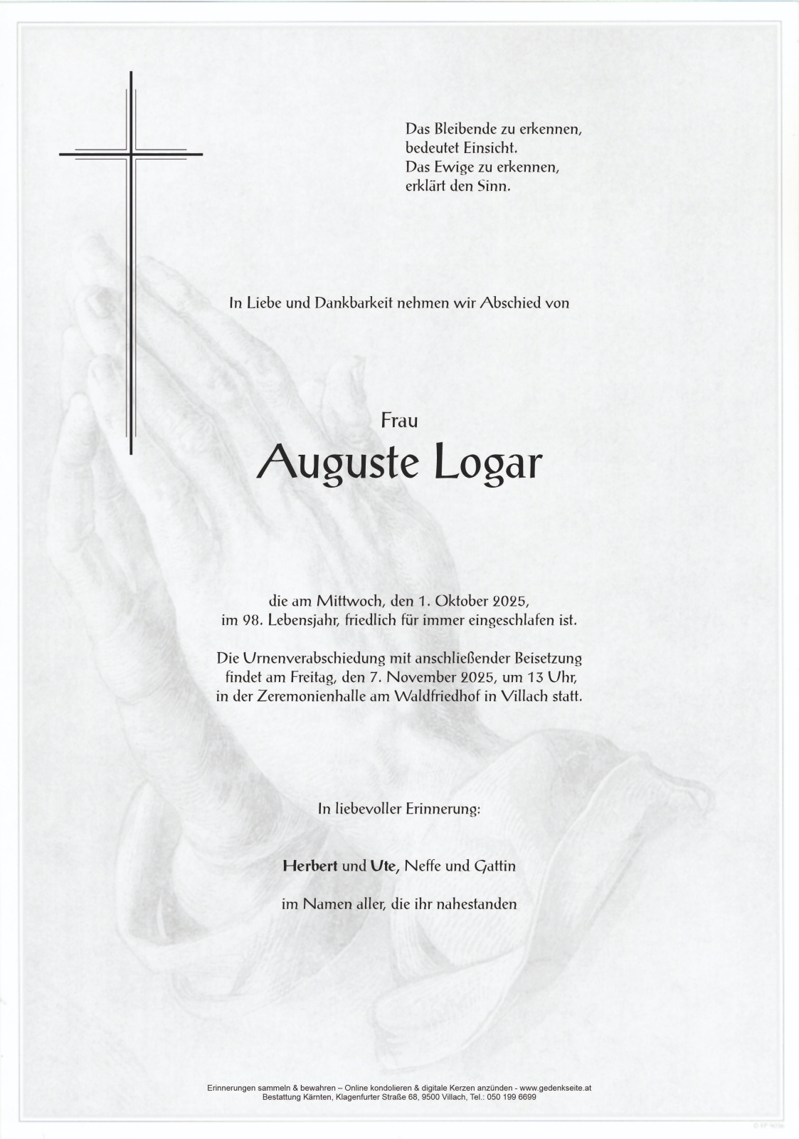Verschicken Sie eine private Nachricht an die Familie & Hinterbliebenen von Auguste Logar. Diese wird nicht veröffentlicht, sondern landet direkt im E-Mail-Postfach der Administrator:innen dieser persönlichen Gedenkseite.