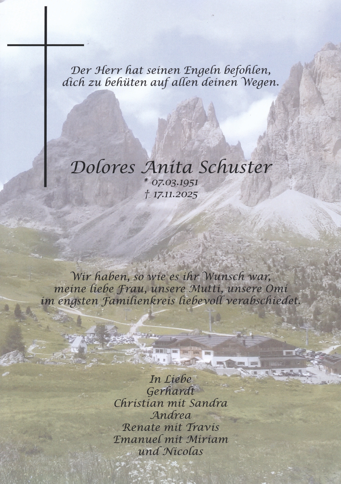 Verschicken Sie eine private Nachricht an die Familie & Hinterbliebenen von Dolores Anita Schuster. Diese wird nicht veröffentlicht, sondern landet direkt im E-Mail-Postfach der Administrator:innen dieser persönlichen Gedenkseite.