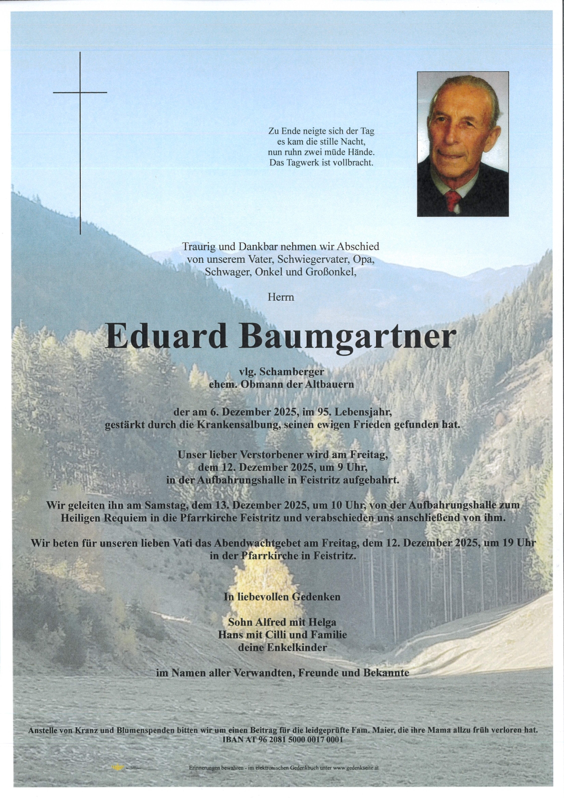 Verschicken Sie eine private Nachricht an die Familie & Hinterbliebenen von Eduard Baumgartner. Diese wird nicht veröffentlicht, sondern landet direkt im E-Mail-Postfach der Administrator:innen dieser persönlichen Gedenkseite.