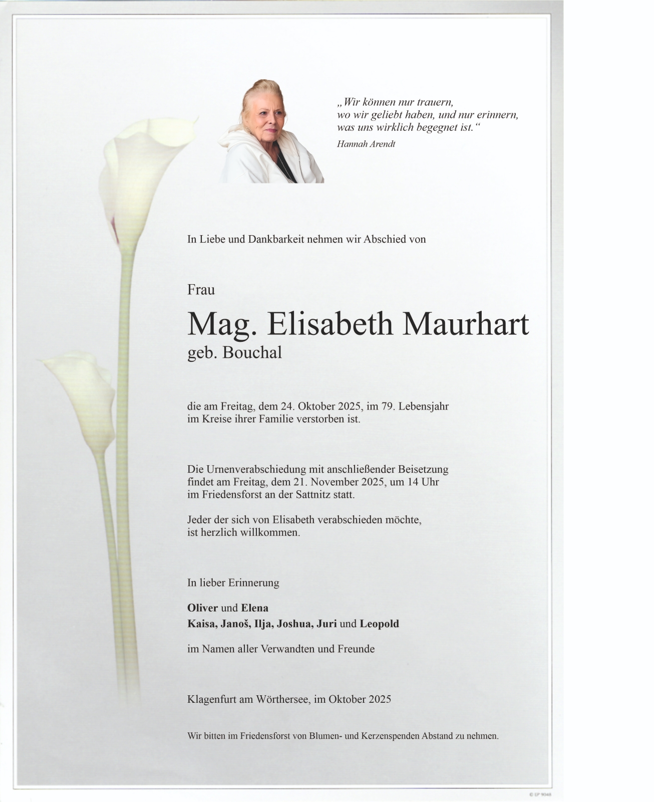Verschicken Sie eine private Nachricht an die Familie & Hinterbliebenen von Elisabeth Maurhart. Diese wird nicht veröffentlicht, sondern landet direkt im E-Mail-Postfach der Administrator:innen dieser persönlichen Gedenkseite.