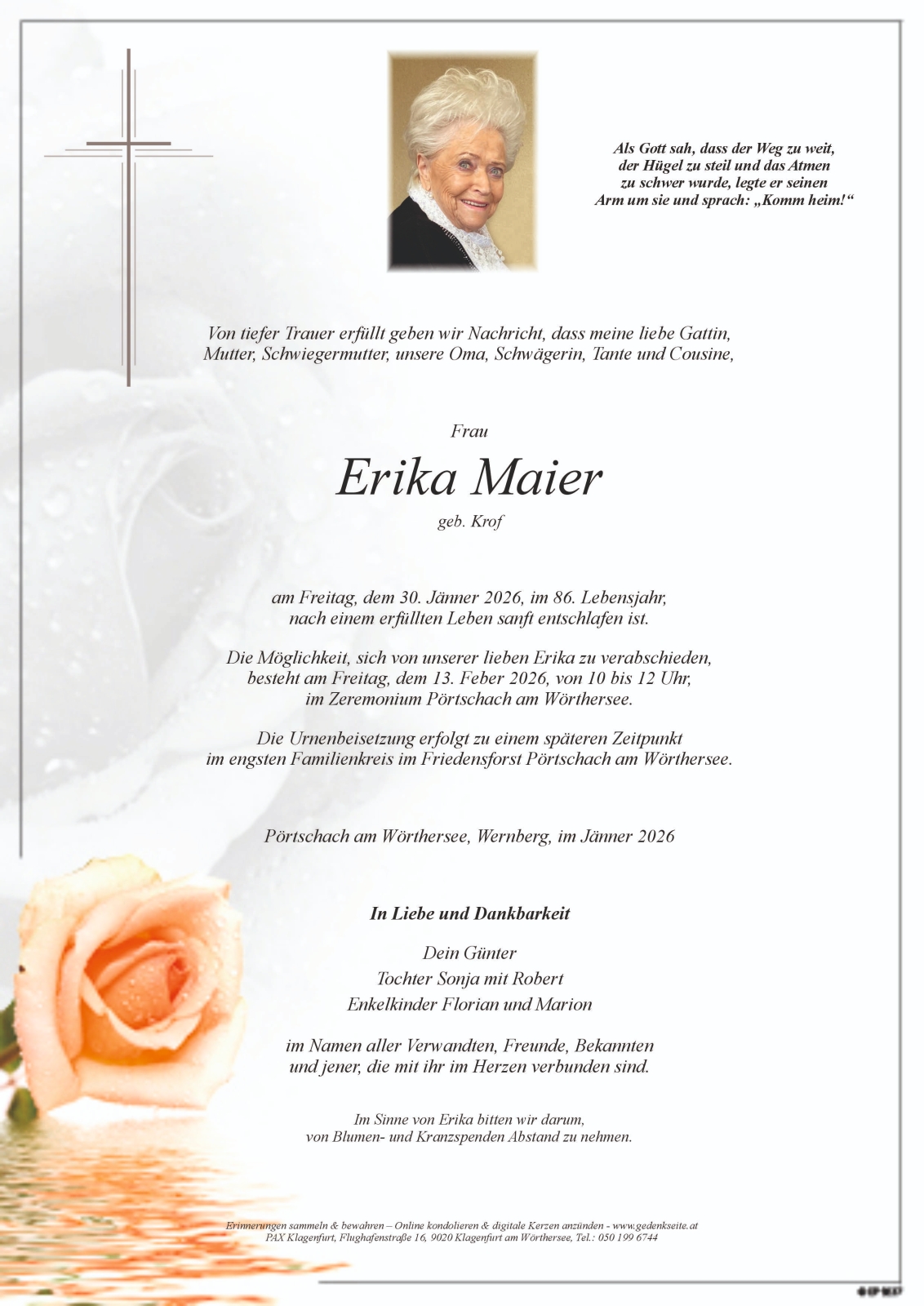 Verschicken Sie eine private Nachricht an die Familie & Hinterbliebenen von Erika Maier. Diese wird nicht veröffentlicht, sondern landet direkt im E-Mail-Postfach der Administrator:innen dieser persönlichen Gedenkseite.