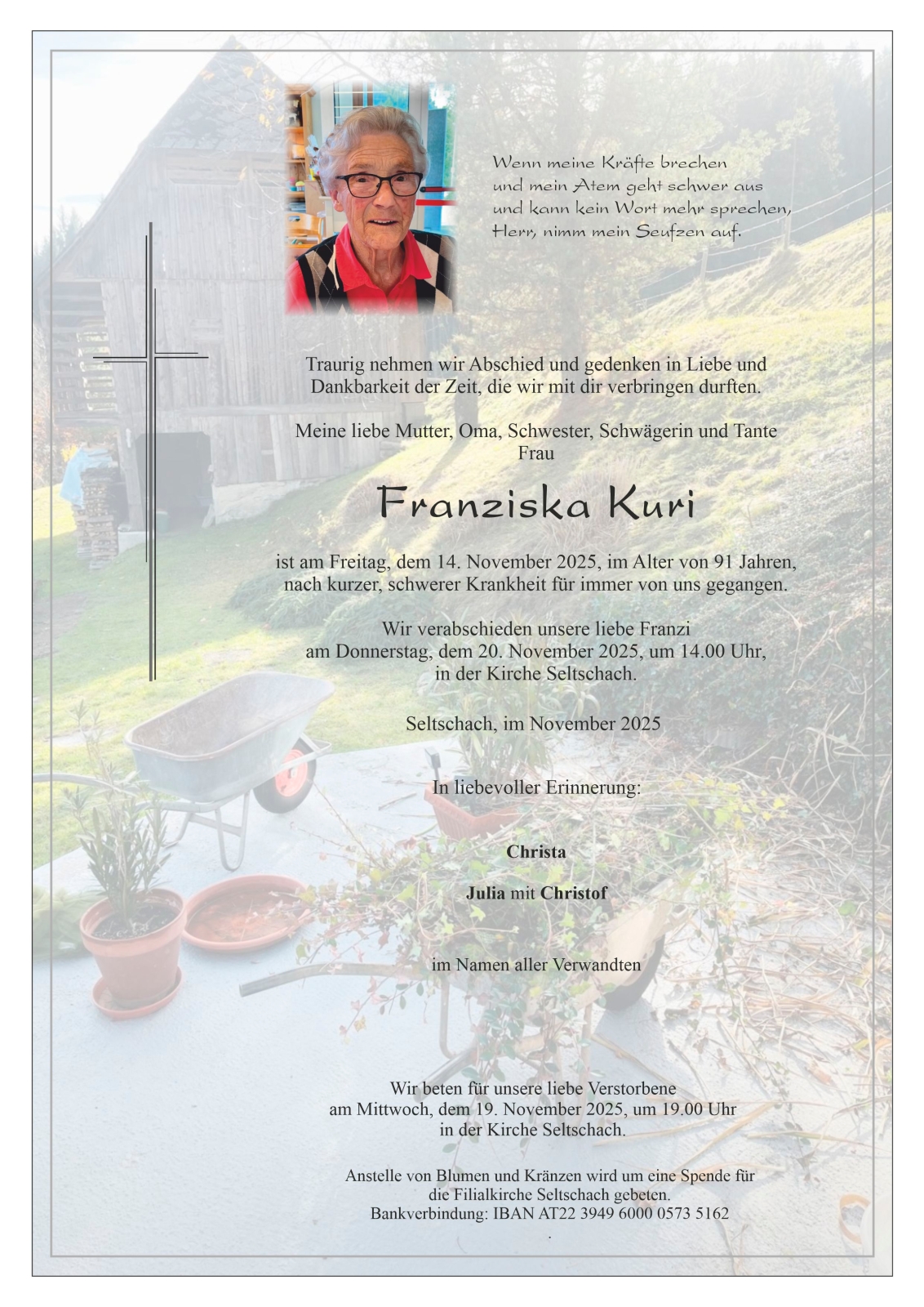 Verschicken Sie eine private Nachricht an die Familie & Hinterbliebenen von Franziska Kuri. Diese wird nicht veröffentlicht, sondern landet direkt im E-Mail-Postfach der Administrator:innen dieser persönlichen Gedenkseite.