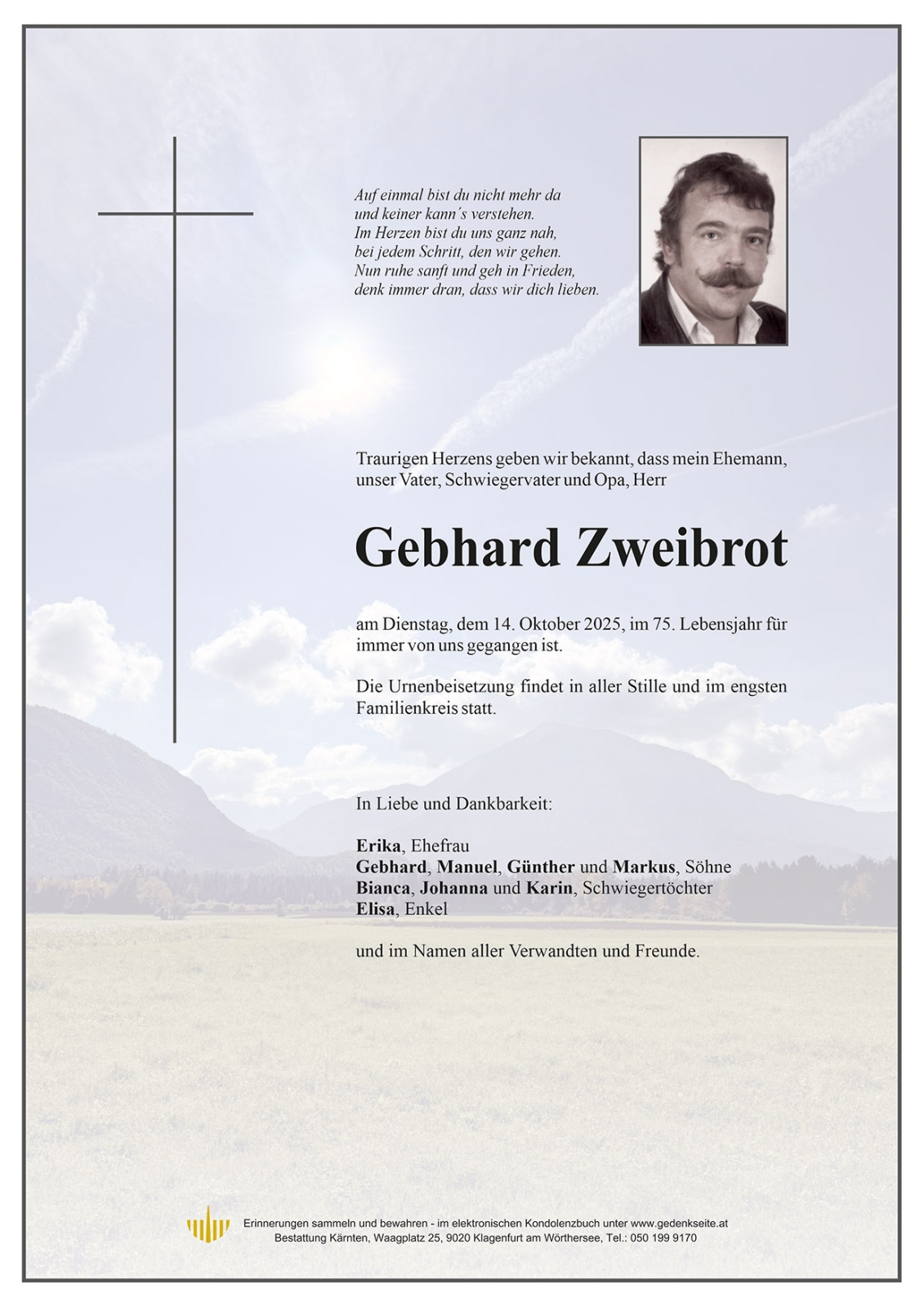 Verschicken Sie eine private Nachricht an die Familie & Hinterbliebenen von Gebhard Zweibrot. Diese wird nicht veröffentlicht, sondern landet direkt im E-Mail-Postfach der Administrator:innen dieser persönlichen Gedenkseite.