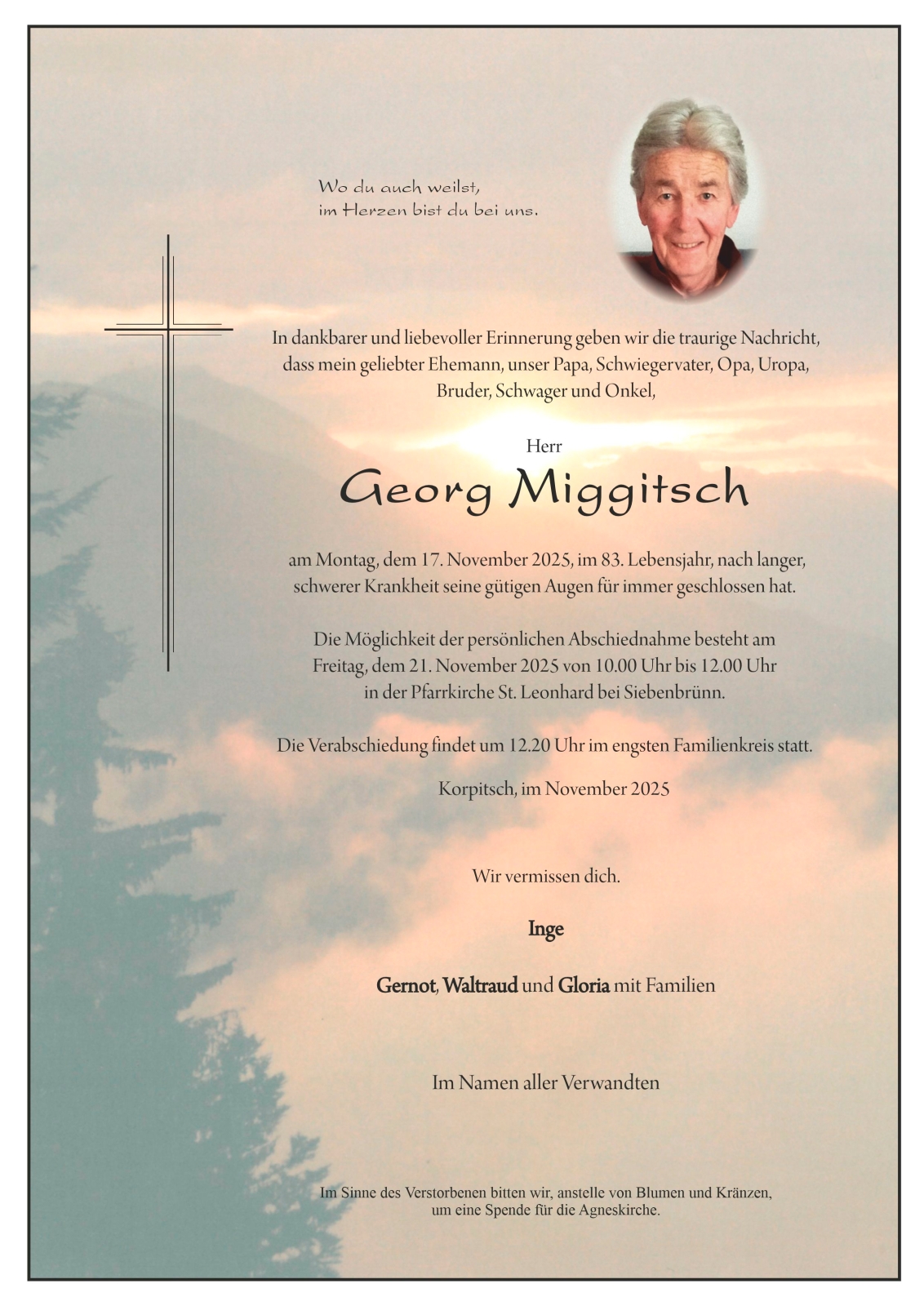 Verschicken Sie eine private Nachricht an die Familie & Hinterbliebenen von Georg Miggitsch. Diese wird nicht veröffentlicht, sondern landet direkt im E-Mail-Postfach der Administrator:innen dieser persönlichen Gedenkseite.