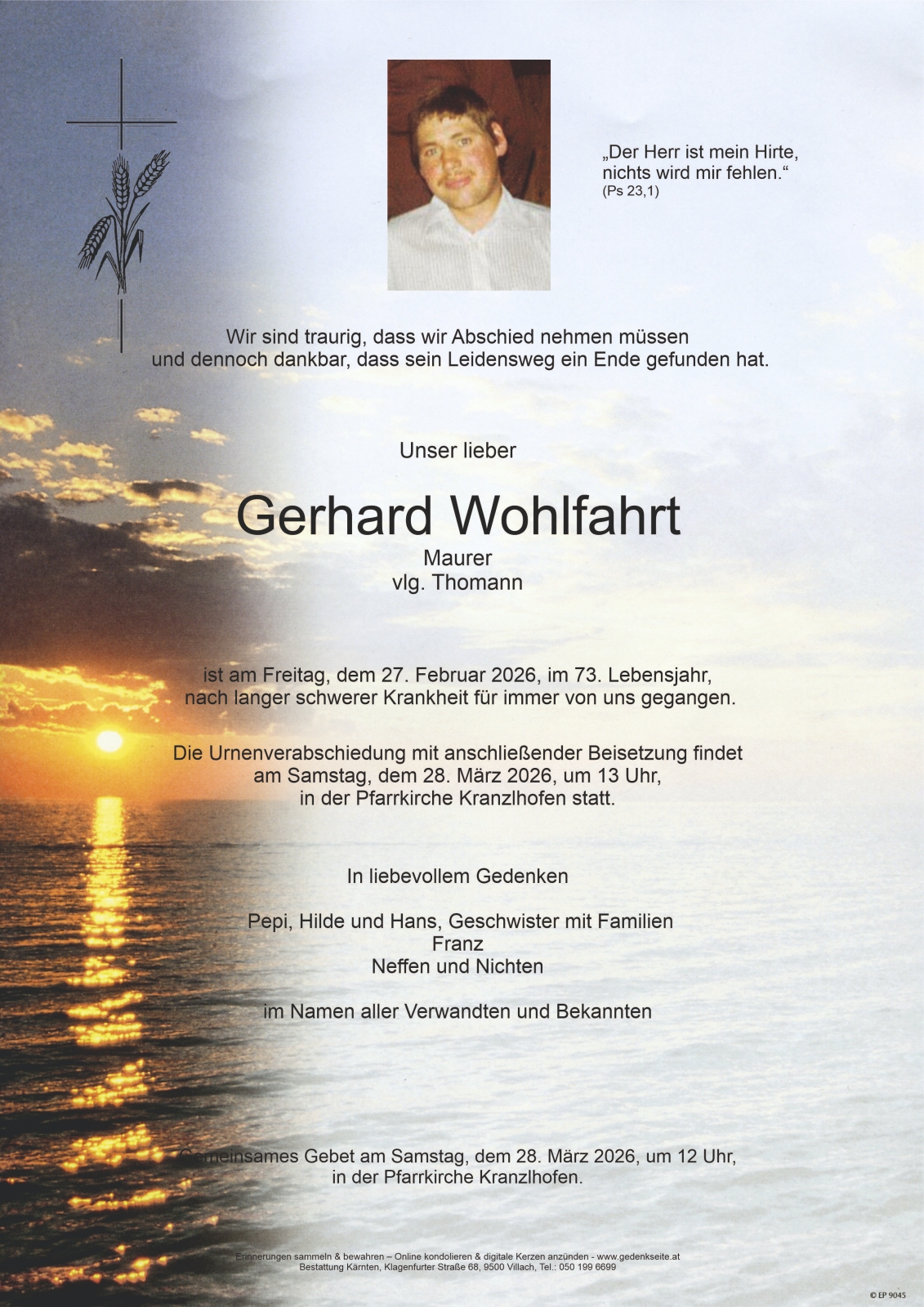 Trauerfeier am 28. März 2026 um 13:00 Uhr,