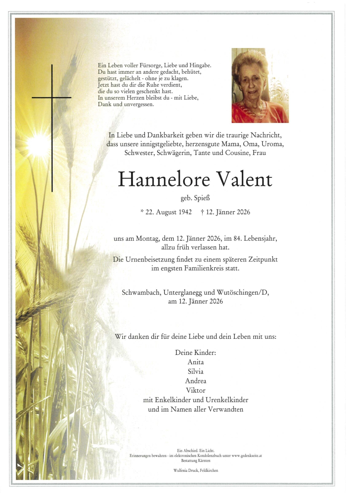 Verschicken Sie eine private Nachricht an die Familie & Hinterbliebenen von Hannelore Valent. Diese wird nicht veröffentlicht, sondern landet direkt im E-Mail-Postfach der Administrator:innen dieser persönlichen Gedenkseite.