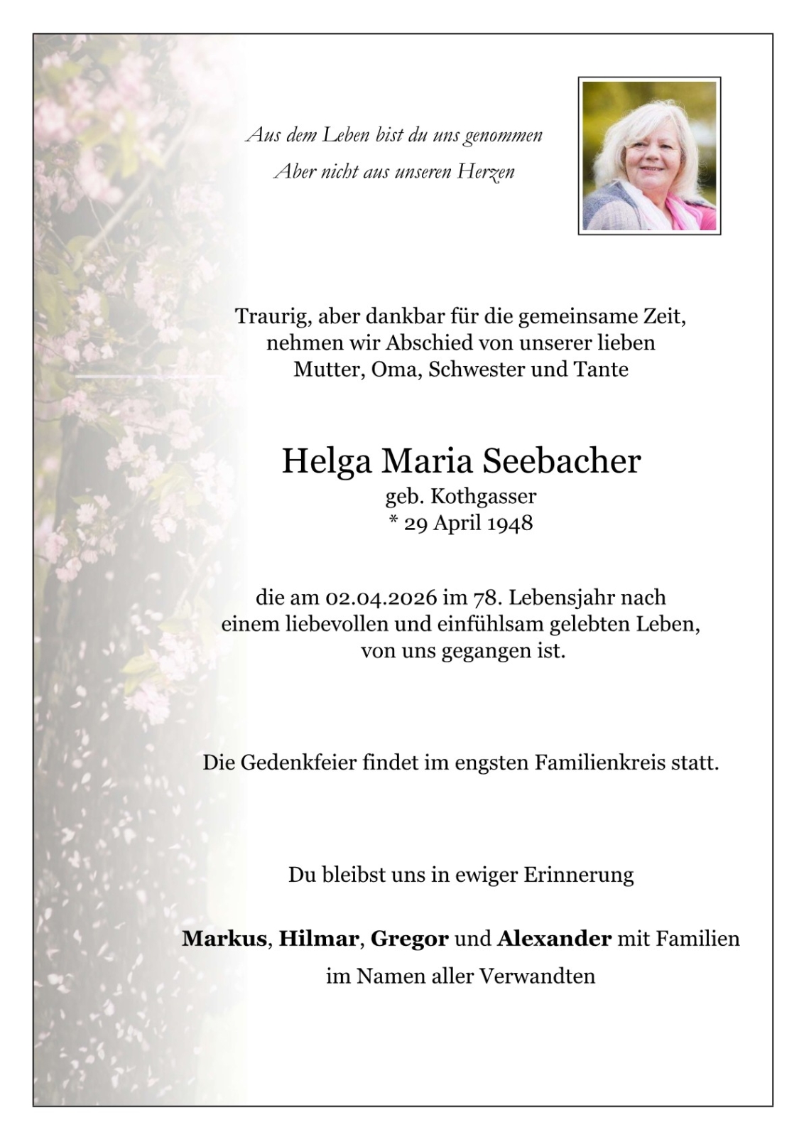 Verschicken Sie eine private Nachricht an die Familie & Hinterbliebenen von Helga Maria Seebacher. Diese wird nicht veröffentlicht, sondern landet direkt im E-Mail-Postfach der Administrator:innen dieser persönlichen Gedenkseite.
