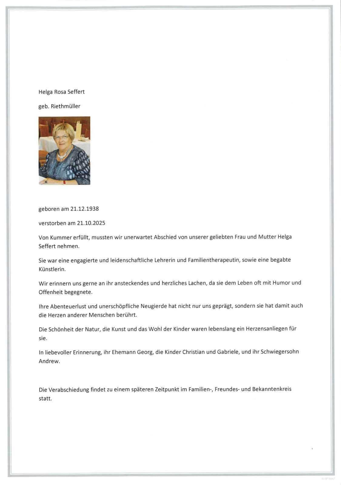 Verschicken Sie eine private Nachricht an die Familie & Hinterbliebenen von Helga Seffert. Diese wird nicht veröffentlicht, sondern landet direkt im E-Mail-Postfach der Administrator:innen dieser persönlichen Gedenkseite.
