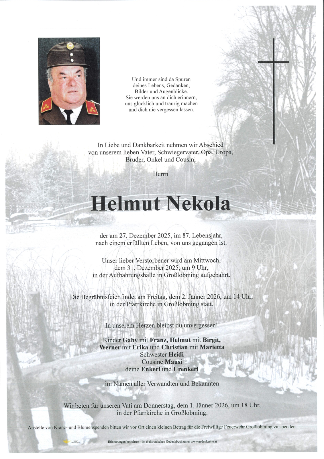 Trauerfeier am 2. Jänner 2026 um 14:00 Uhr,