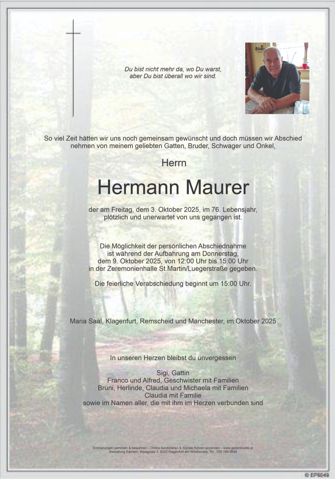 Verschicken Sie eine private Nachricht an die Familie & Hinterbliebenen von Hermann Maurer. Diese wird nicht veröffentlicht, sondern landet direkt im E-Mail-Postfach der Administrator:innen dieser persönlichen Gedenkseite.