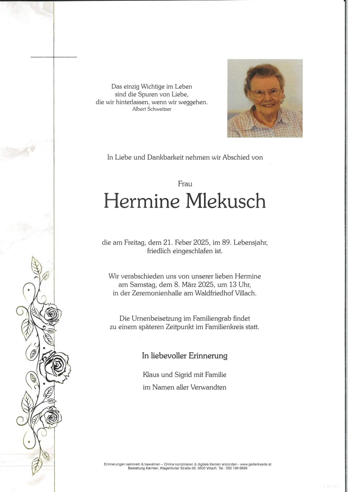 Verschicken Sie eine private Nachricht an die Familie & Hinterbliebenen von Hermine Mlekusch. Diese wird nicht veröffentlicht, sondern landet direkt im E-Mail-Postfach der Administrator:innen dieser persönlichen Gedenkseite.