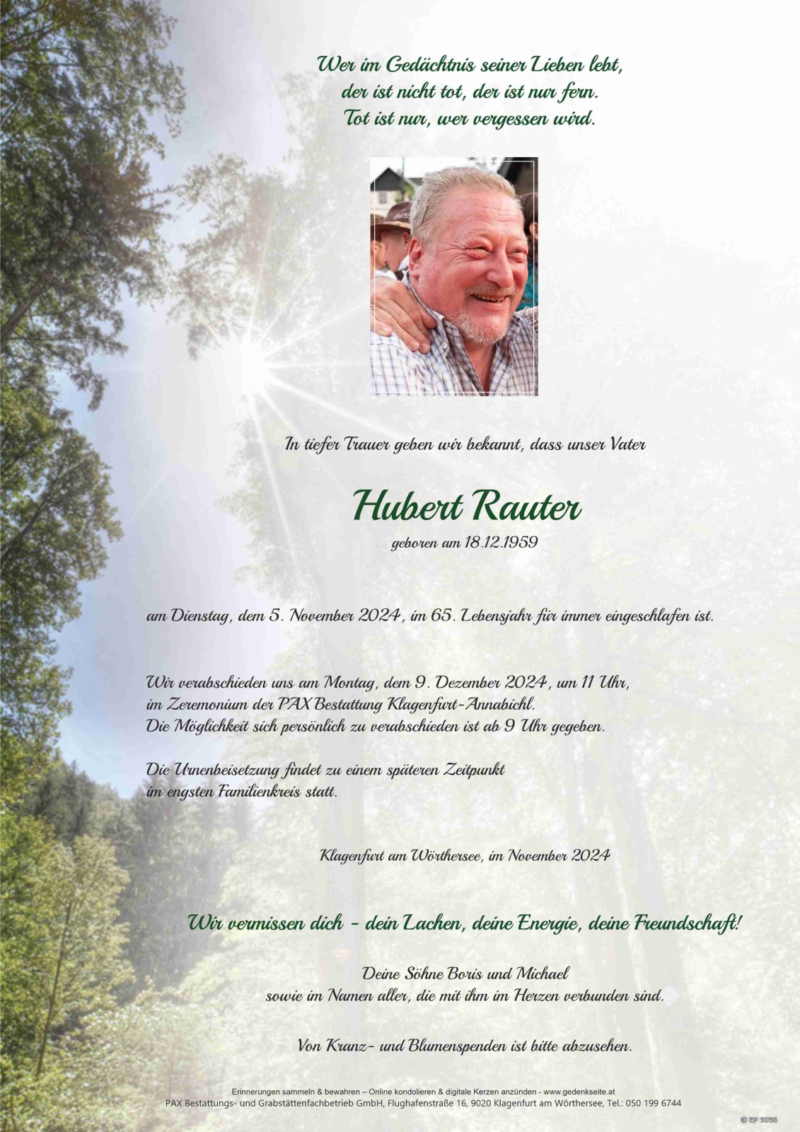 Verschicken Sie eine private Nachricht an die Familie & Hinterbliebenen von Hubert Rauter. Diese wird nicht veröffentlicht, sondern landet direkt im E-Mail-Postfach der Administrator:innen dieser persönlichen Gedenkseite.