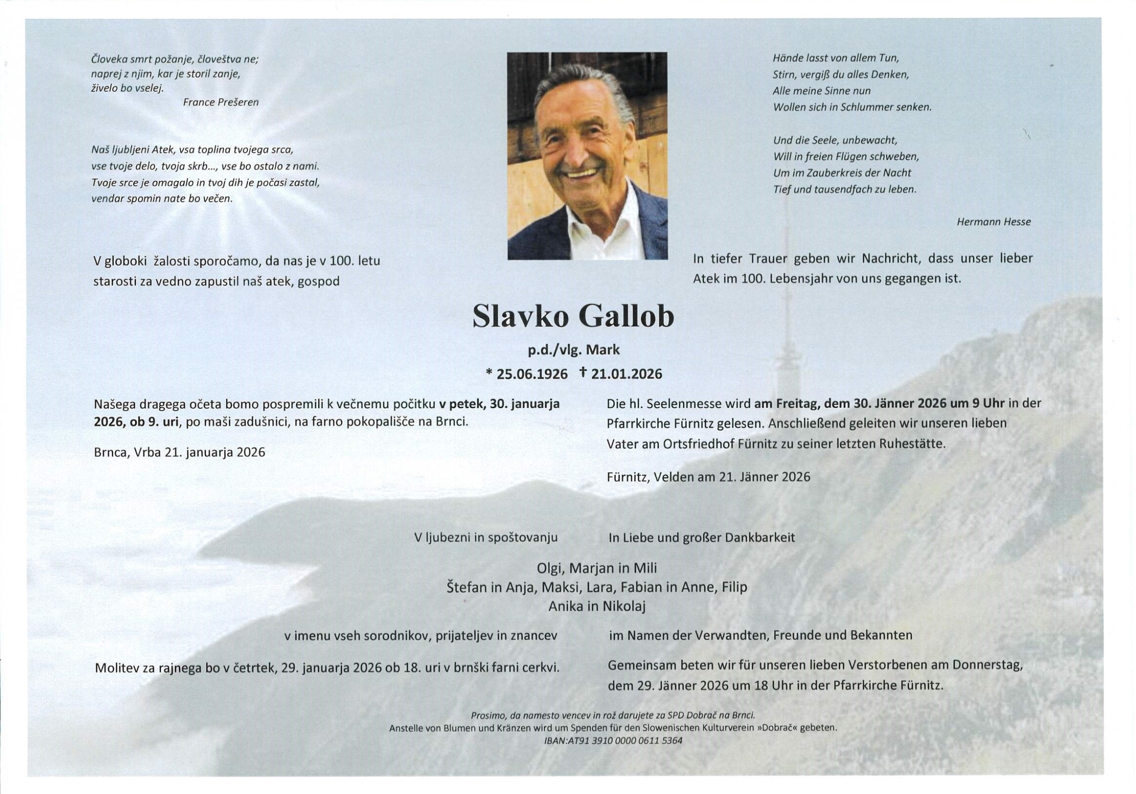 Trauerfeier am 30. Jänner 2026 um 09:00 Uhr,