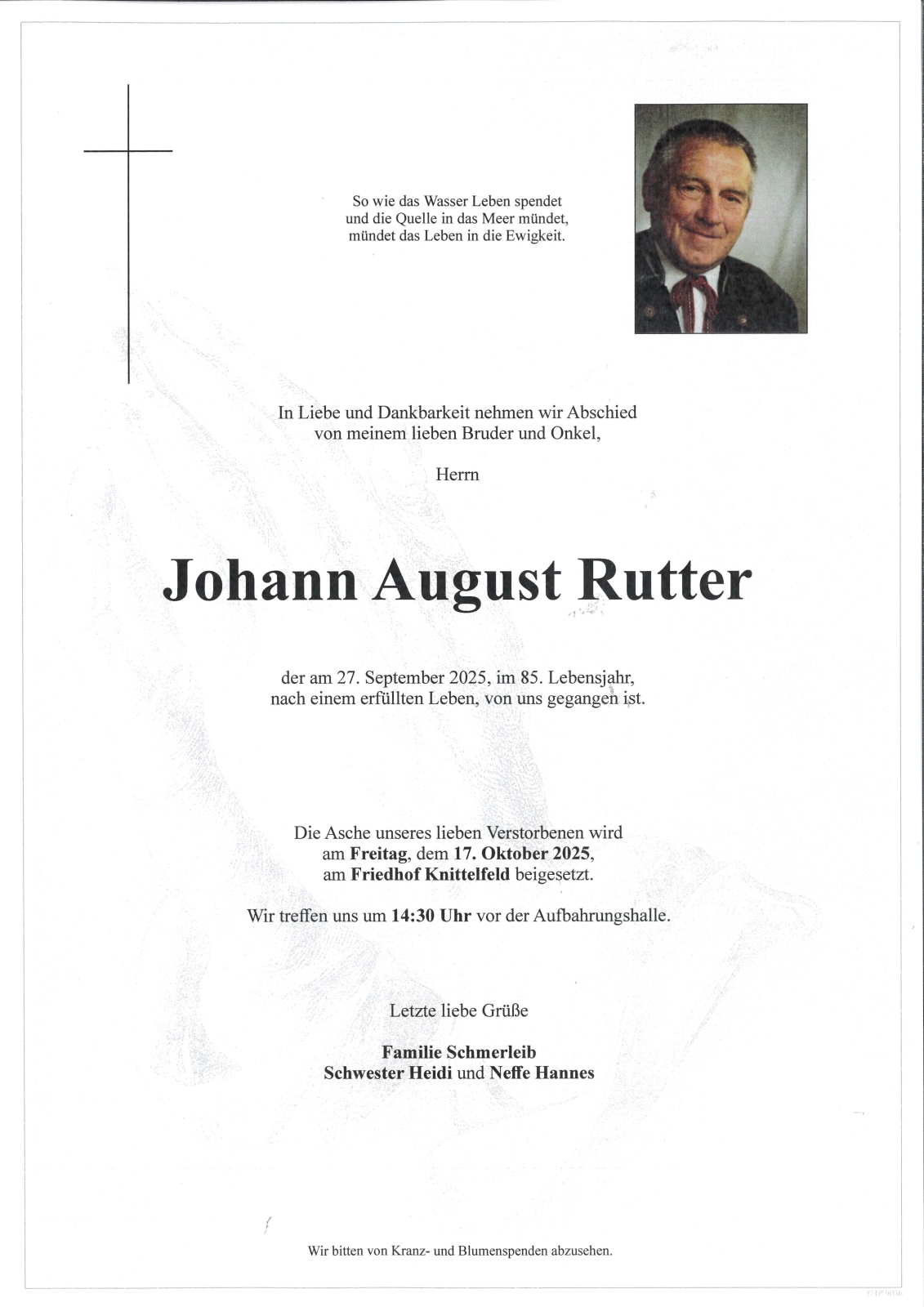 Verschicken Sie eine private Nachricht an die Familie & Hinterbliebenen von Johann August Rutter. Diese wird nicht veröffentlicht, sondern landet direkt im E-Mail-Postfach der Administrator:innen dieser persönlichen Gedenkseite.