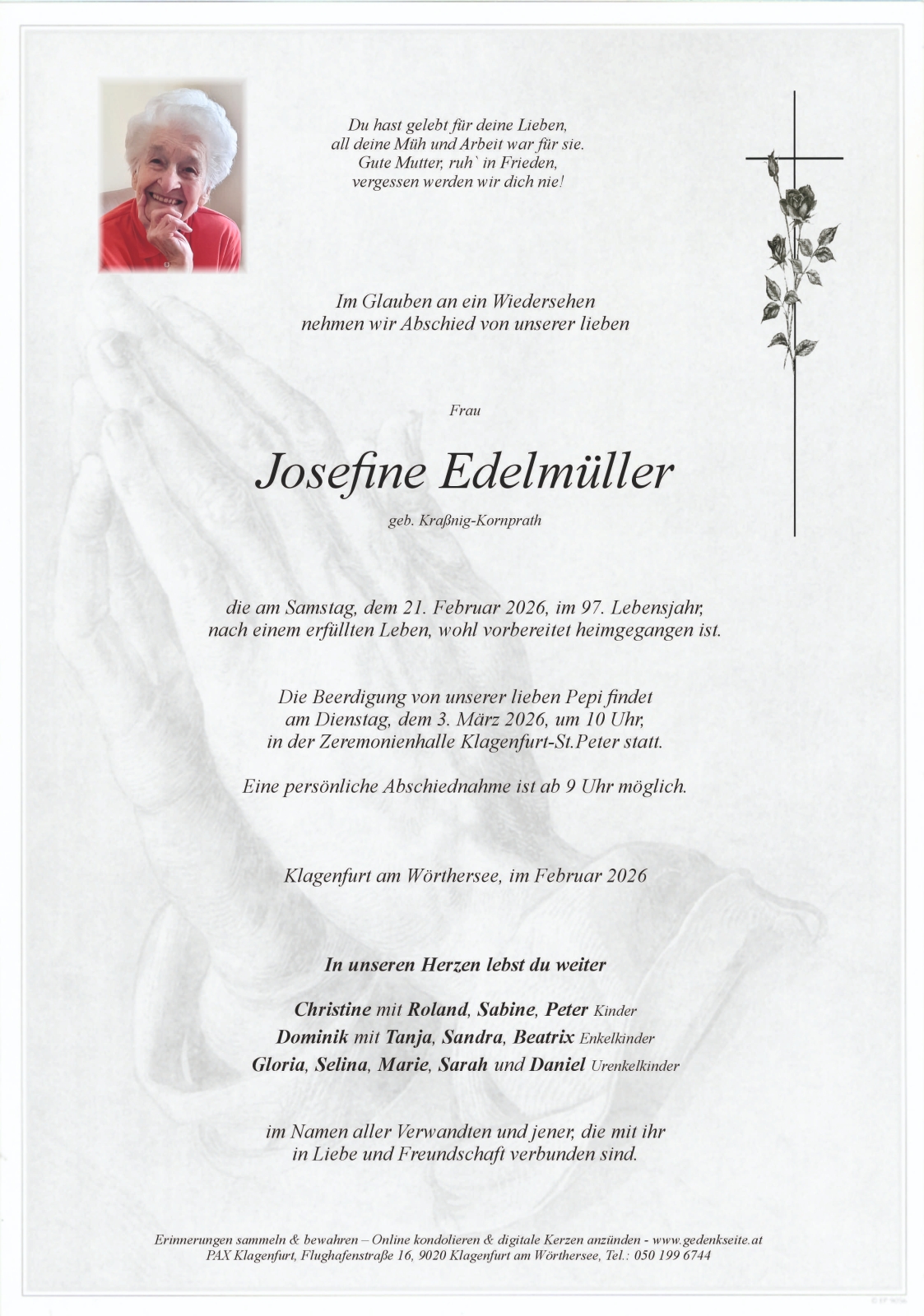 Verschicken Sie eine private Nachricht an die Familie & Hinterbliebenen von Josefine Edelmüller. Diese wird nicht veröffentlicht, sondern landet direkt im E-Mail-Postfach der Administrator:innen dieser persönlichen Gedenkseite.