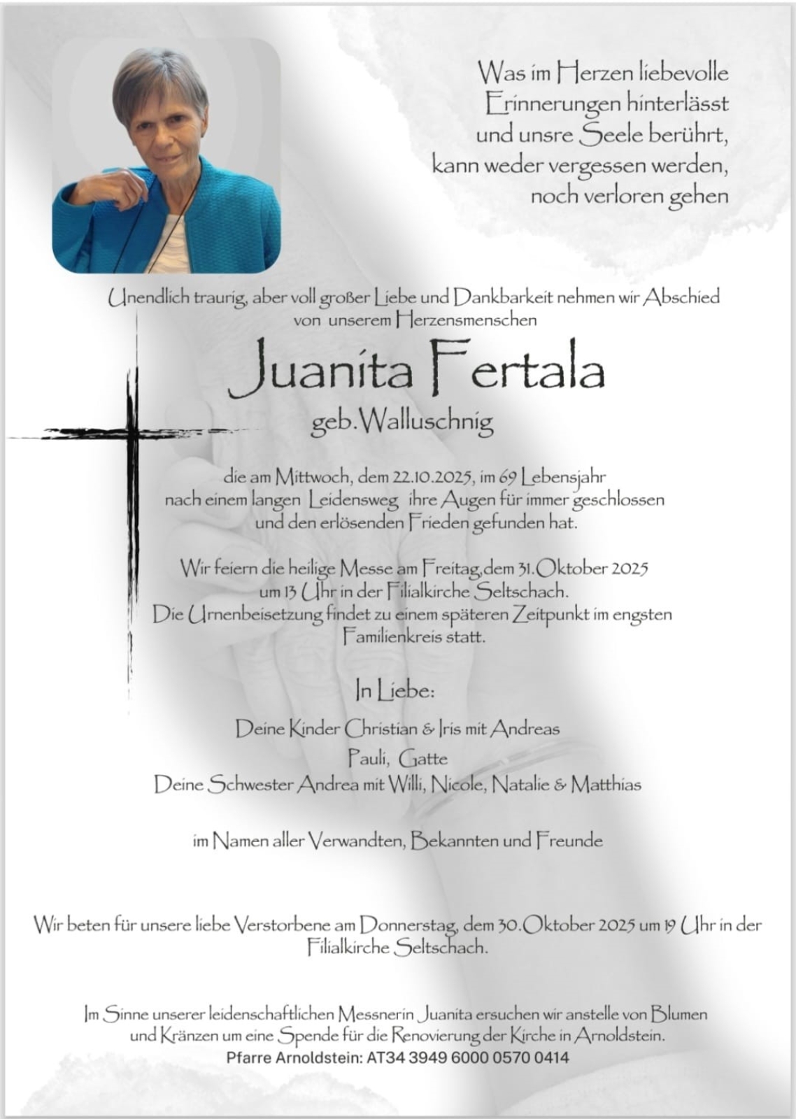 Verschicken Sie eine private Nachricht an die Familie & Hinterbliebenen von Juanita Fertala. Diese wird nicht veröffentlicht, sondern landet direkt im E-Mail-Postfach der Administrator:innen dieser persönlichen Gedenkseite.