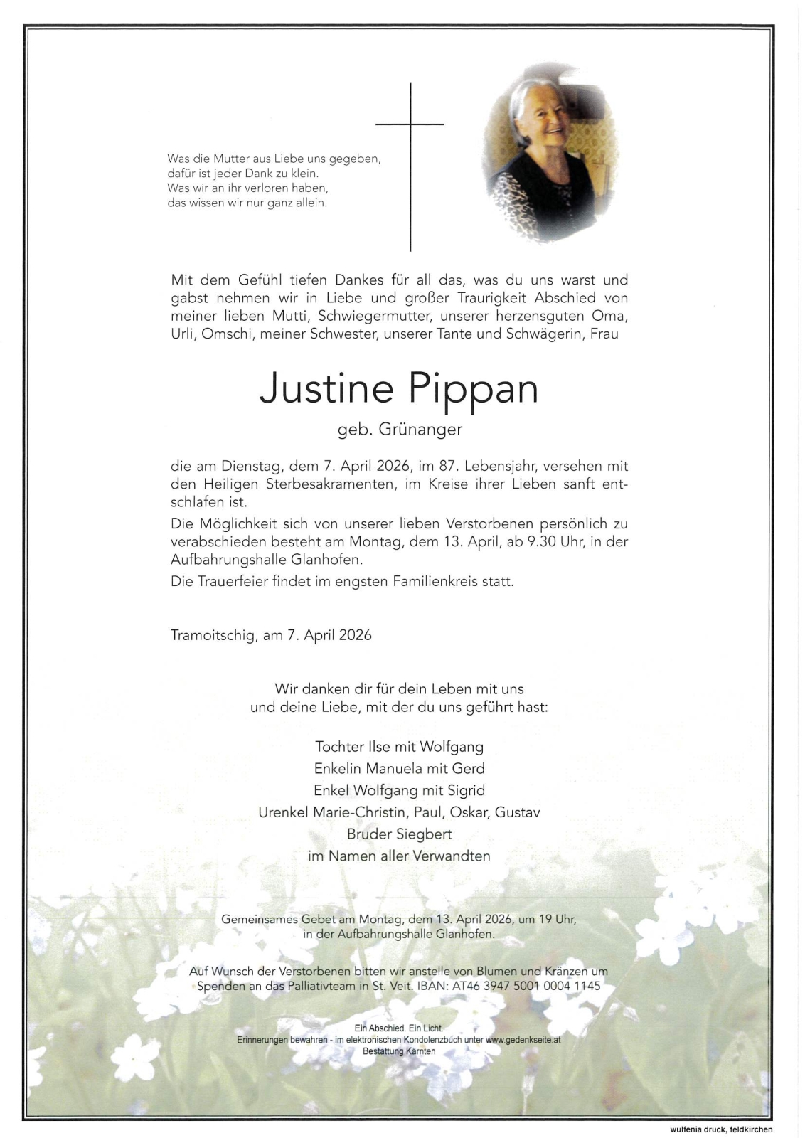Verschicken Sie eine private Nachricht an die Familie & Hinterbliebenen von Justine Pippan. Diese wird nicht veröffentlicht, sondern landet direkt im E-Mail-Postfach der Administrator:innen dieser persönlichen Gedenkseite.