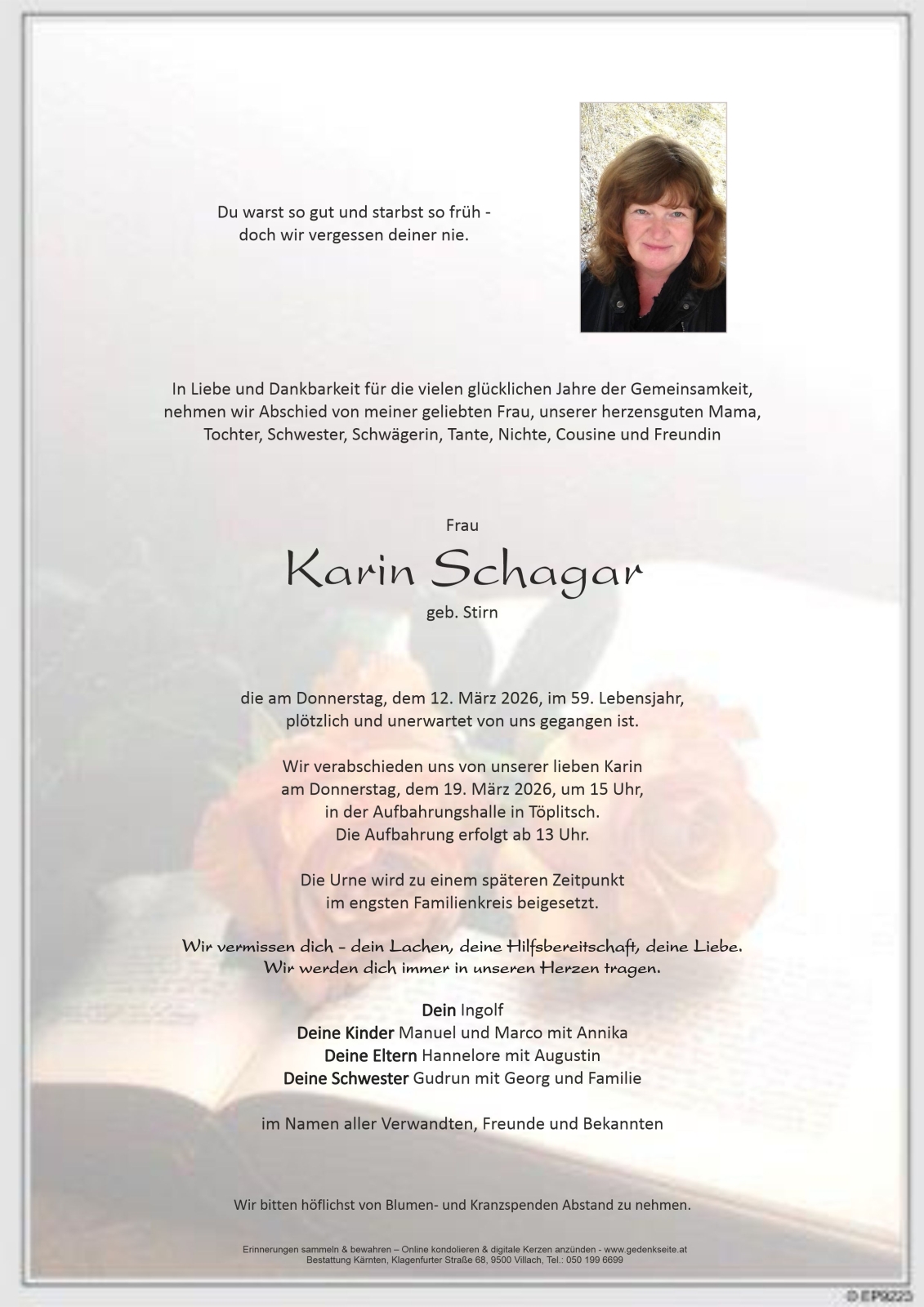 Verschicken Sie eine private Nachricht an die Familie & Hinterbliebenen von Karin Schagar. Diese wird nicht veröffentlicht, sondern landet direkt im E-Mail-Postfach der Administrator:innen dieser persönlichen Gedenkseite.