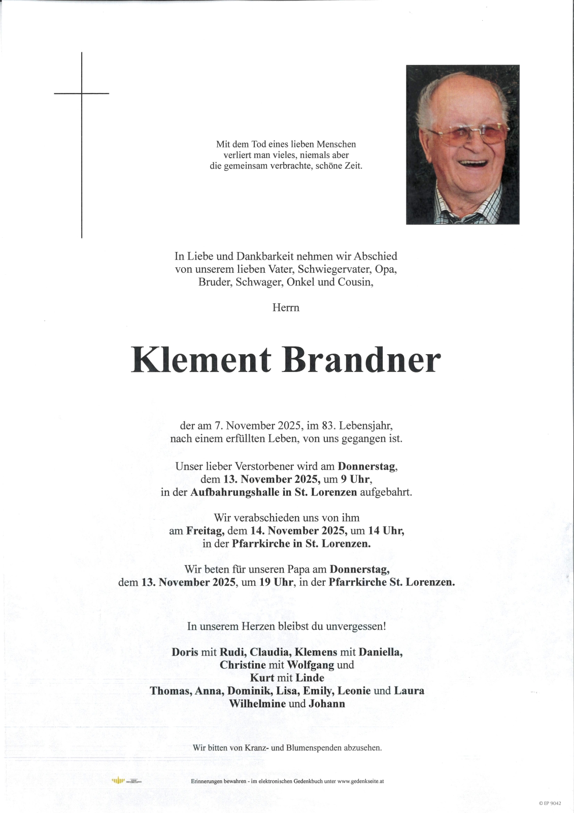 Verschicken Sie eine private Nachricht an die Familie & Hinterbliebenen von Klement Brandner. Diese wird nicht veröffentlicht, sondern landet direkt im E-Mail-Postfach der Administrator:innen dieser persönlichen Gedenkseite.