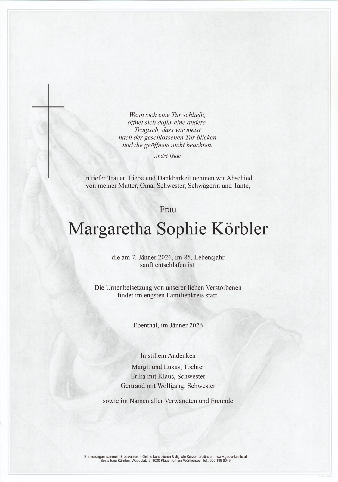 Verschicken Sie eine private Nachricht an die Familie & Hinterbliebenen von Margaretha Sophie Körbler. Diese wird nicht veröffentlicht, sondern landet direkt im E-Mail-Postfach der Administrator:innen dieser persönlichen Gedenkseite.