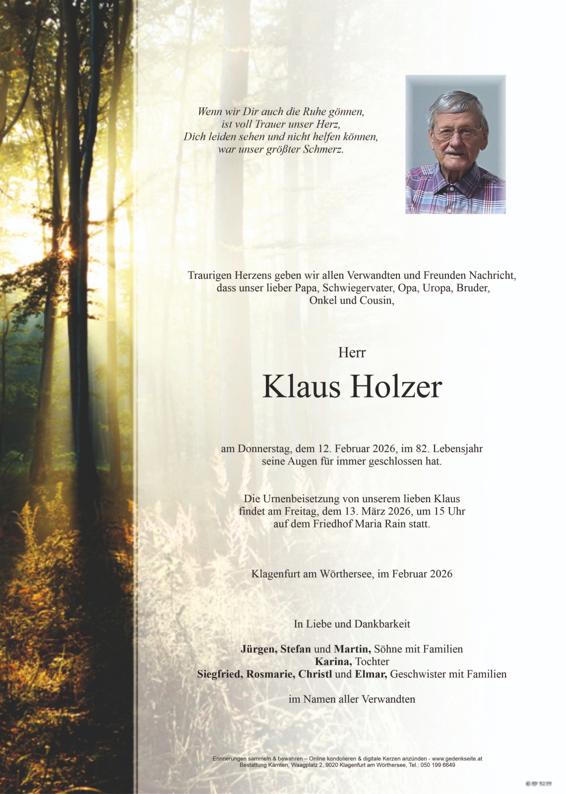 Verschicken Sie eine private Nachricht an die Familie & Hinterbliebenen von Klaus Holzer. Diese wird nicht veröffentlicht, sondern landet direkt im E-Mail-Postfach der Administrator:innen dieser persönlichen Gedenkseite.