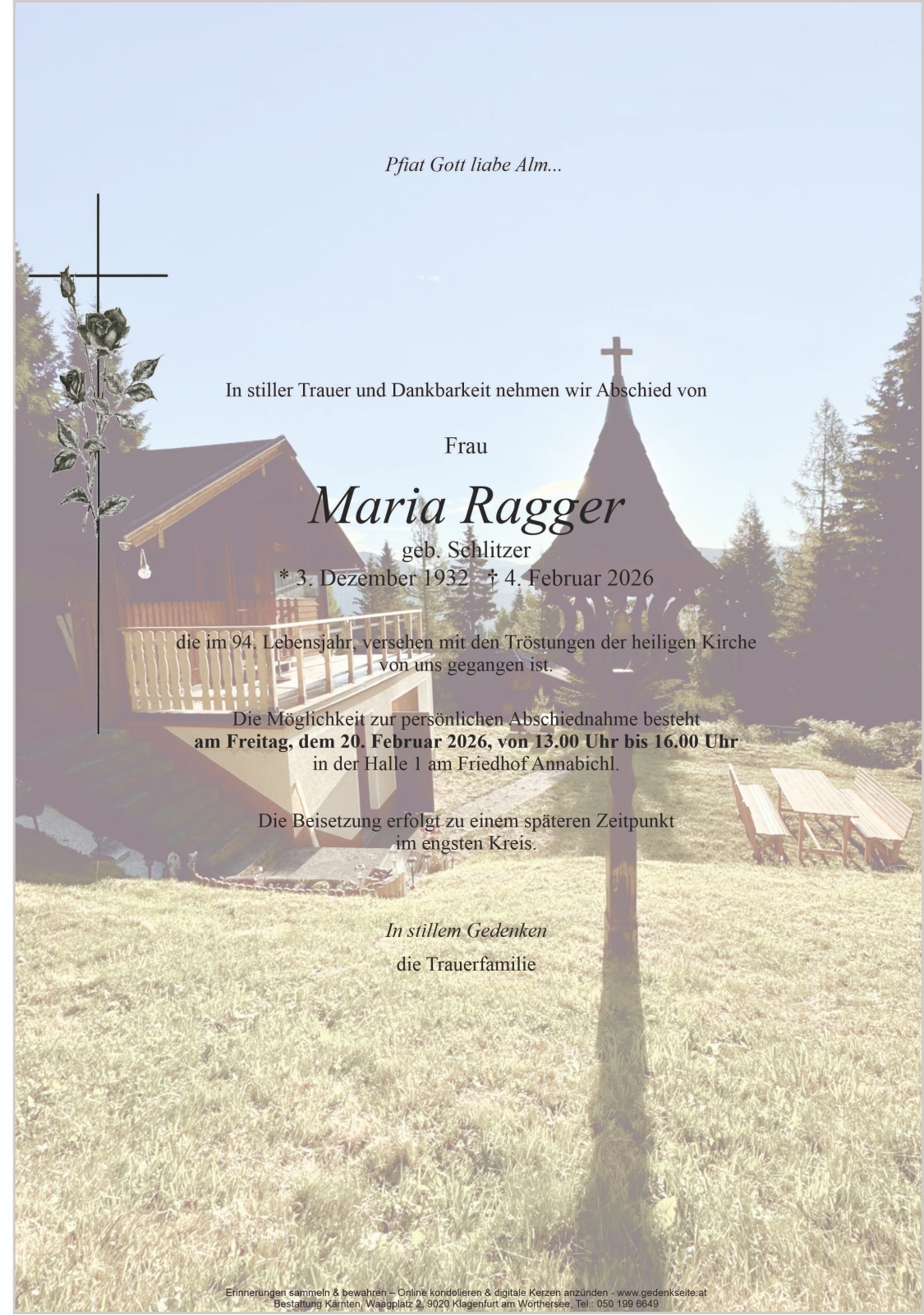 Verschicken Sie eine private Nachricht an die Familie & Hinterbliebenen von Maria Ragger. Diese wird nicht veröffentlicht, sondern landet direkt im E-Mail-Postfach der Administrator:innen dieser persönlichen Gedenkseite.