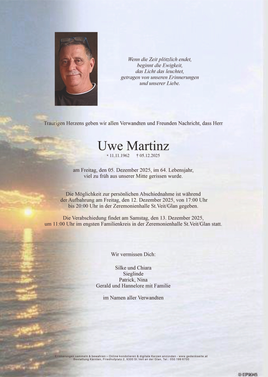 Verschicken Sie eine private Nachricht an die Familie & Hinterbliebenen von Uwe Martinz. Diese wird nicht veröffentlicht, sondern landet direkt im E-Mail-Postfach der Administrator:innen dieser persönlichen Gedenkseite.