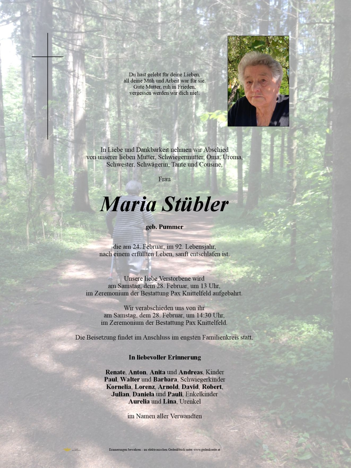 Verschicken Sie eine private Nachricht an die Familie & Hinterbliebenen von Maria Stübler. Diese wird nicht veröffentlicht, sondern landet direkt im E-Mail-Postfach der Administrator:innen dieser persönlichen Gedenkseite.