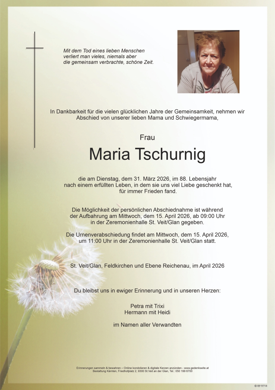 Verschicken Sie eine private Nachricht an die Familie & Hinterbliebenen von Maria Tschurnig. Diese wird nicht veröffentlicht, sondern landet direkt im E-Mail-Postfach der Administrator:innen dieser persönlichen Gedenkseite.