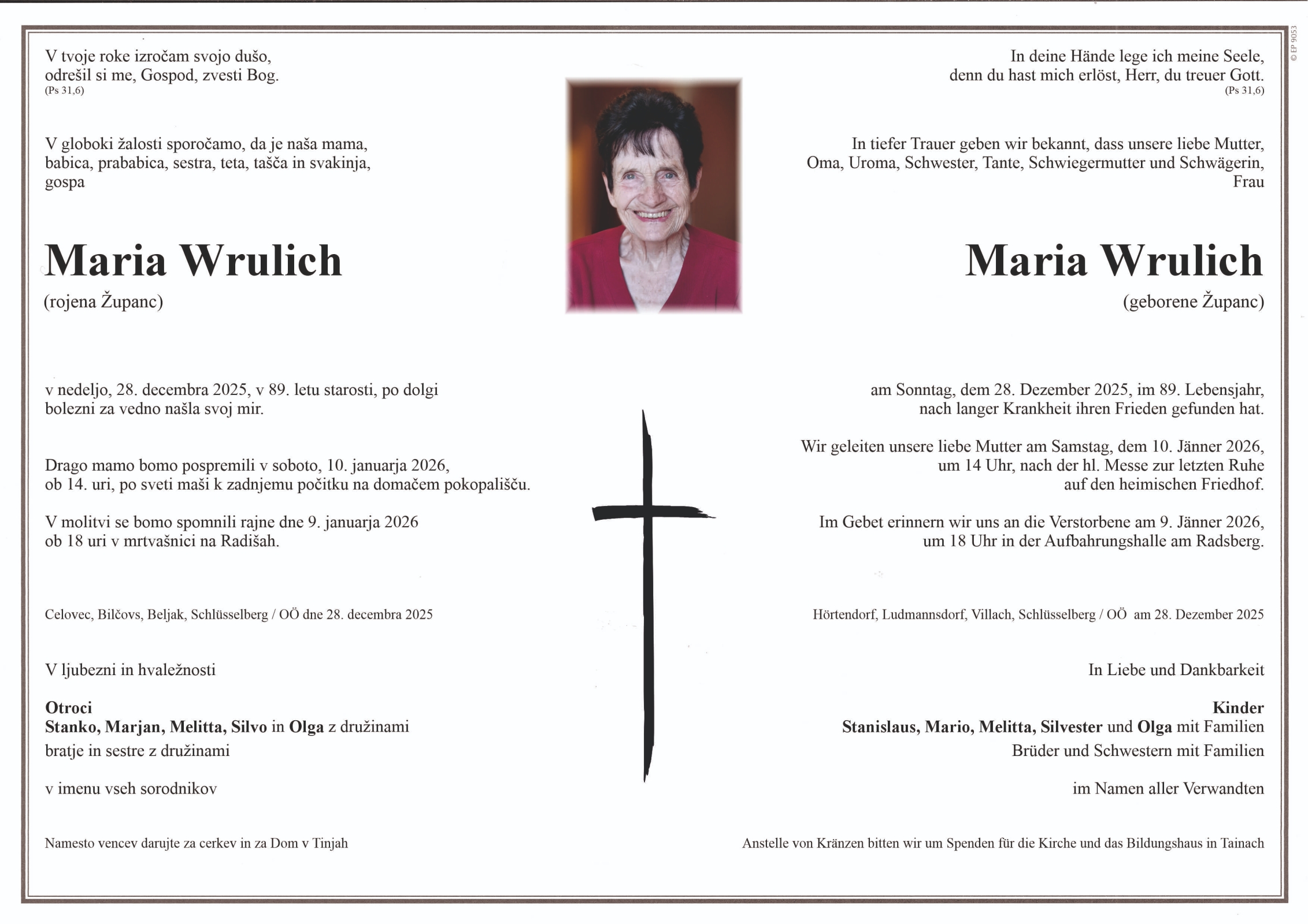 Verschicken Sie eine private Nachricht an die Familie & Hinterbliebenen von Maria Wrulich. Diese wird nicht veröffentlicht, sondern landet direkt im E-Mail-Postfach der Administrator:innen dieser persönlichen Gedenkseite.