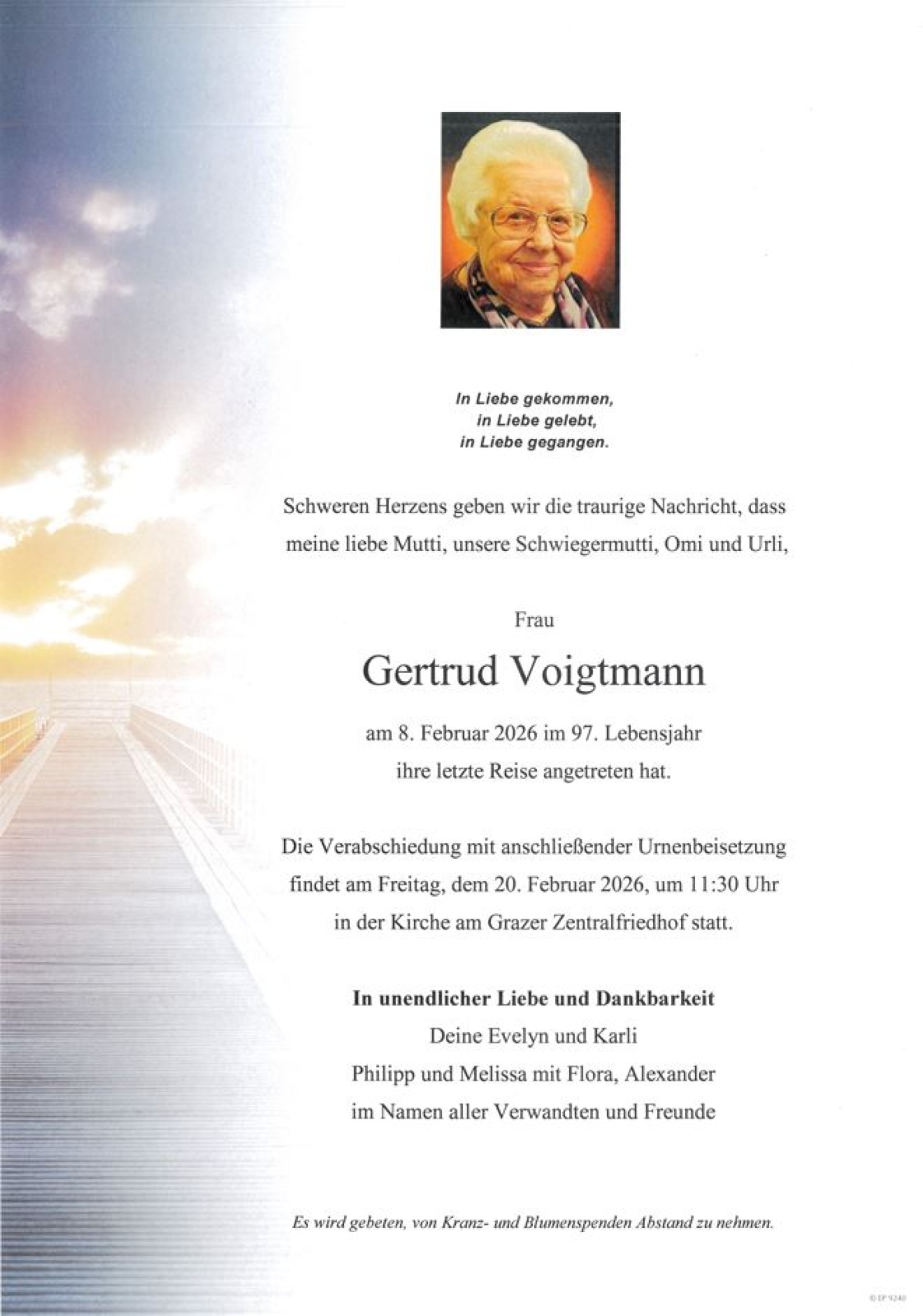 Trauerfeier am 20. Februar 2026 um 11:30 Uhr,