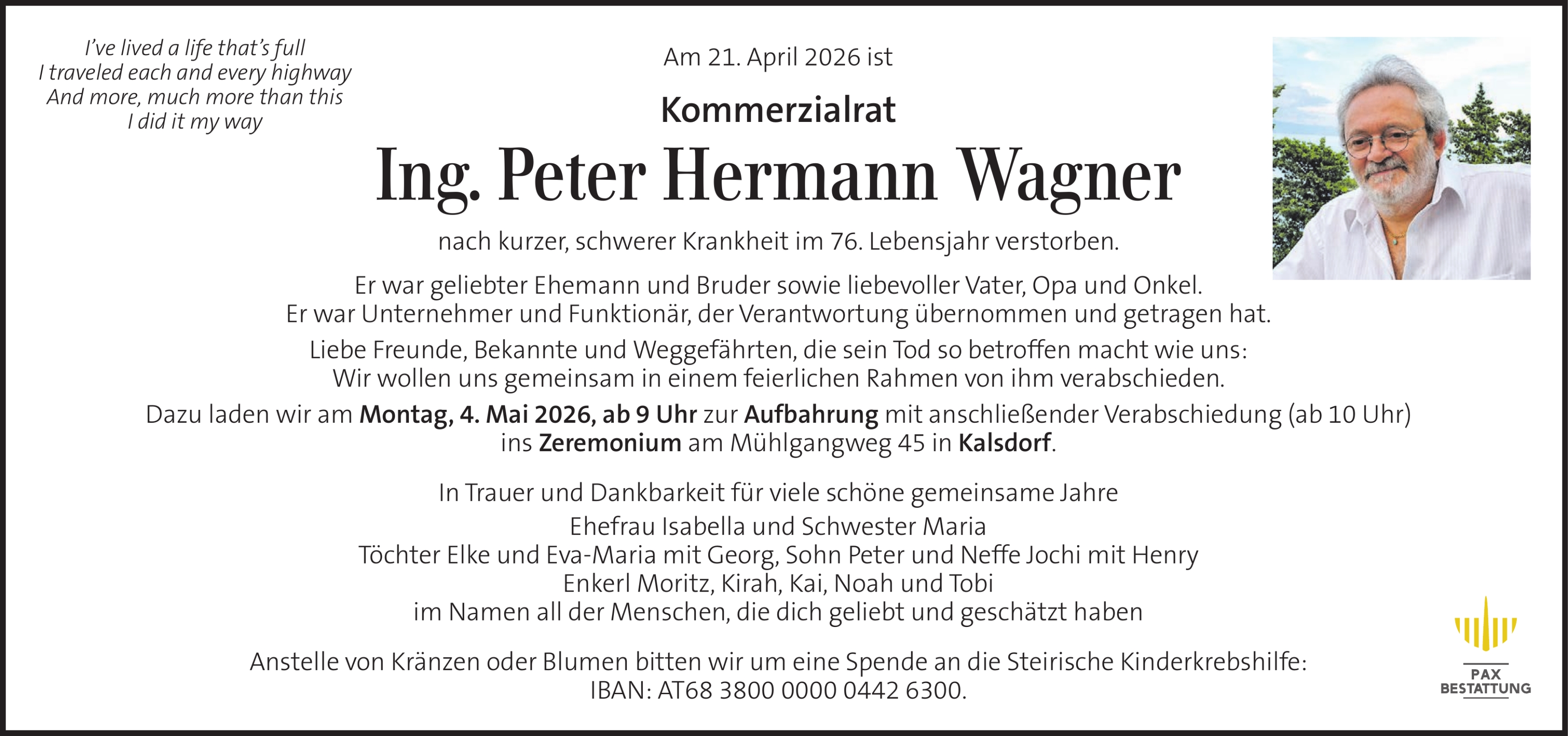 Verschicken Sie eine private Nachricht an die Familie & Hinterbliebenen von Peter Wagner. Diese wird nicht veröffentlicht, sondern landet direkt im E-Mail-Postfach der Administrator:innen dieser persönlichen Gedenkseite.