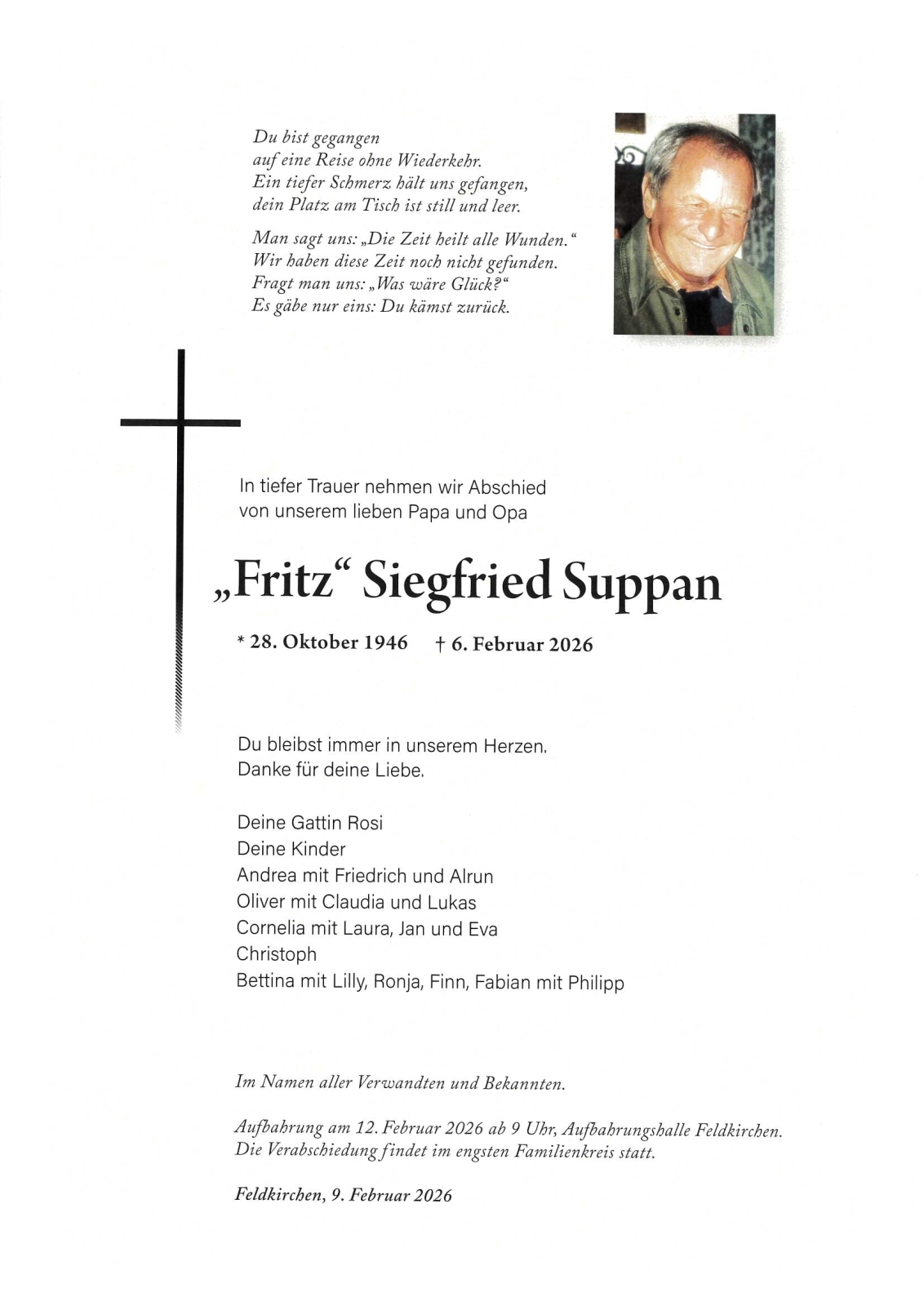 Verschicken Sie eine private Nachricht an die Familie & Hinterbliebenen von Siegfried Suppan. Diese wird nicht veröffentlicht, sondern landet direkt im E-Mail-Postfach der Administrator:innen dieser persönlichen Gedenkseite.