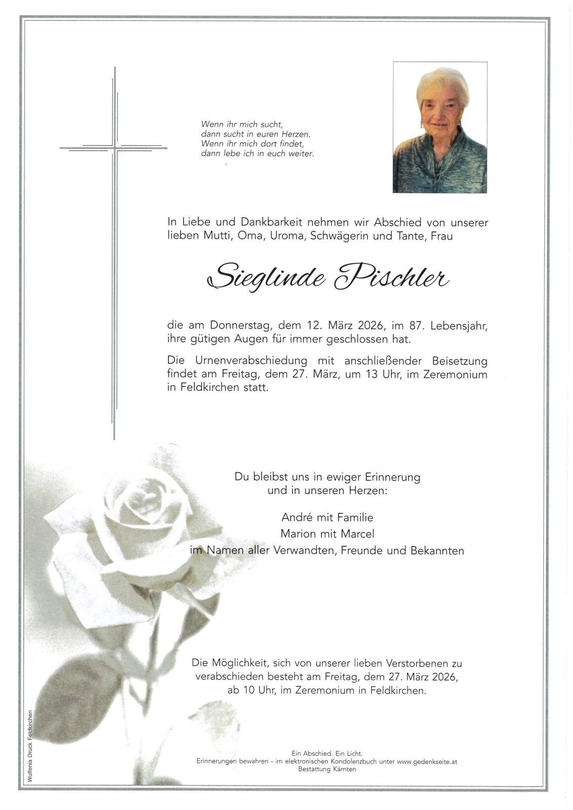 Verschicken Sie eine private Nachricht an die Familie & Hinterbliebenen von Sieglinde Pischler. Diese wird nicht veröffentlicht, sondern landet direkt im E-Mail-Postfach der Administrator:innen dieser persönlichen Gedenkseite.