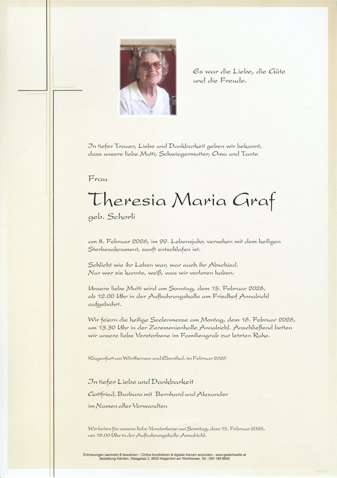 Verschicken Sie eine private Nachricht an die Familie & Hinterbliebenen von Theresia Maria Graf. Diese wird nicht veröffentlicht, sondern landet direkt im E-Mail-Postfach der Administrator:innen dieser persönlichen Gedenkseite.