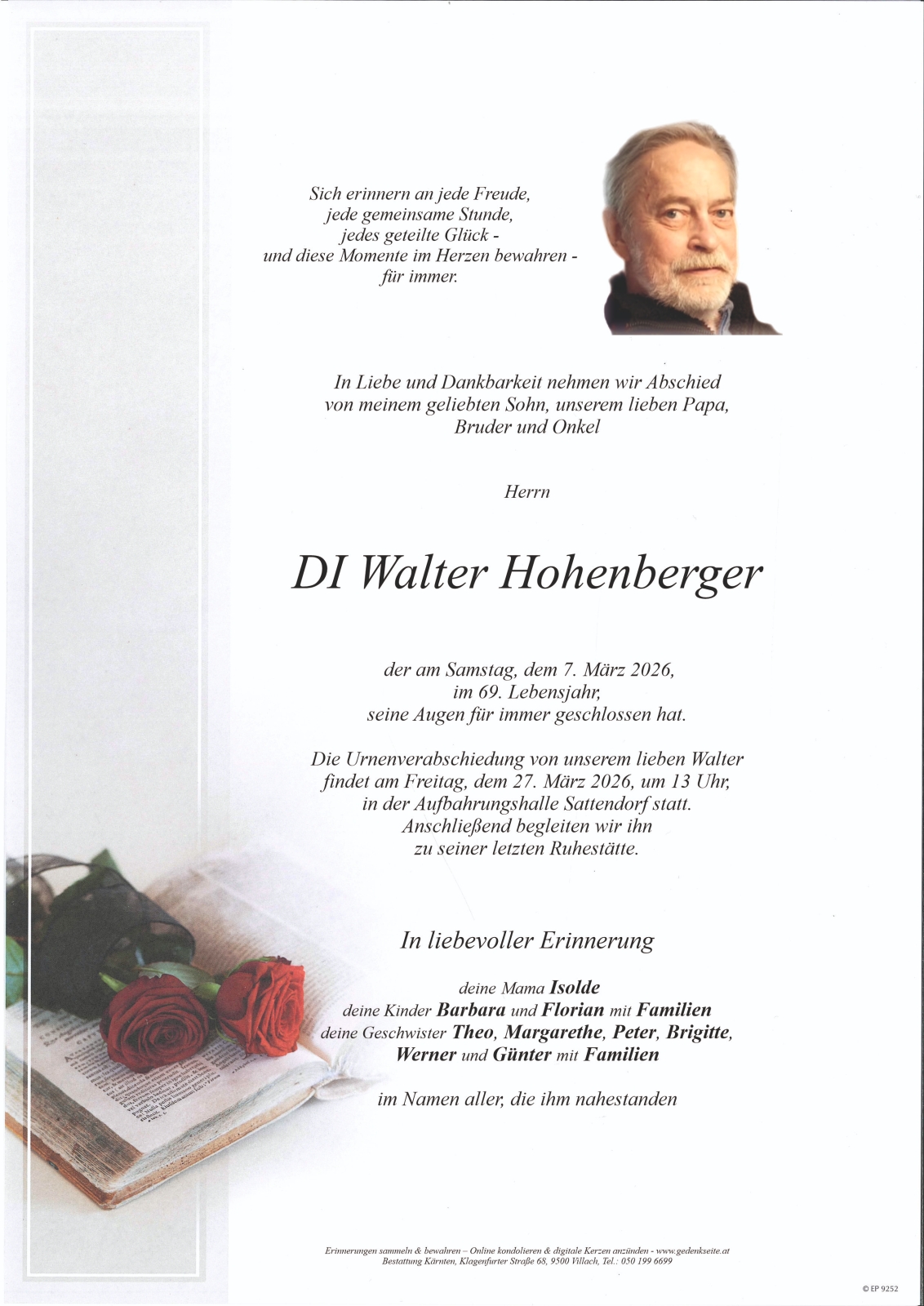 Verschicken Sie eine private Nachricht an die Familie & Hinterbliebenen von Walter Hohenberger. Diese wird nicht veröffentlicht, sondern landet direkt im E-Mail-Postfach der Administrator:innen dieser persönlichen Gedenkseite.