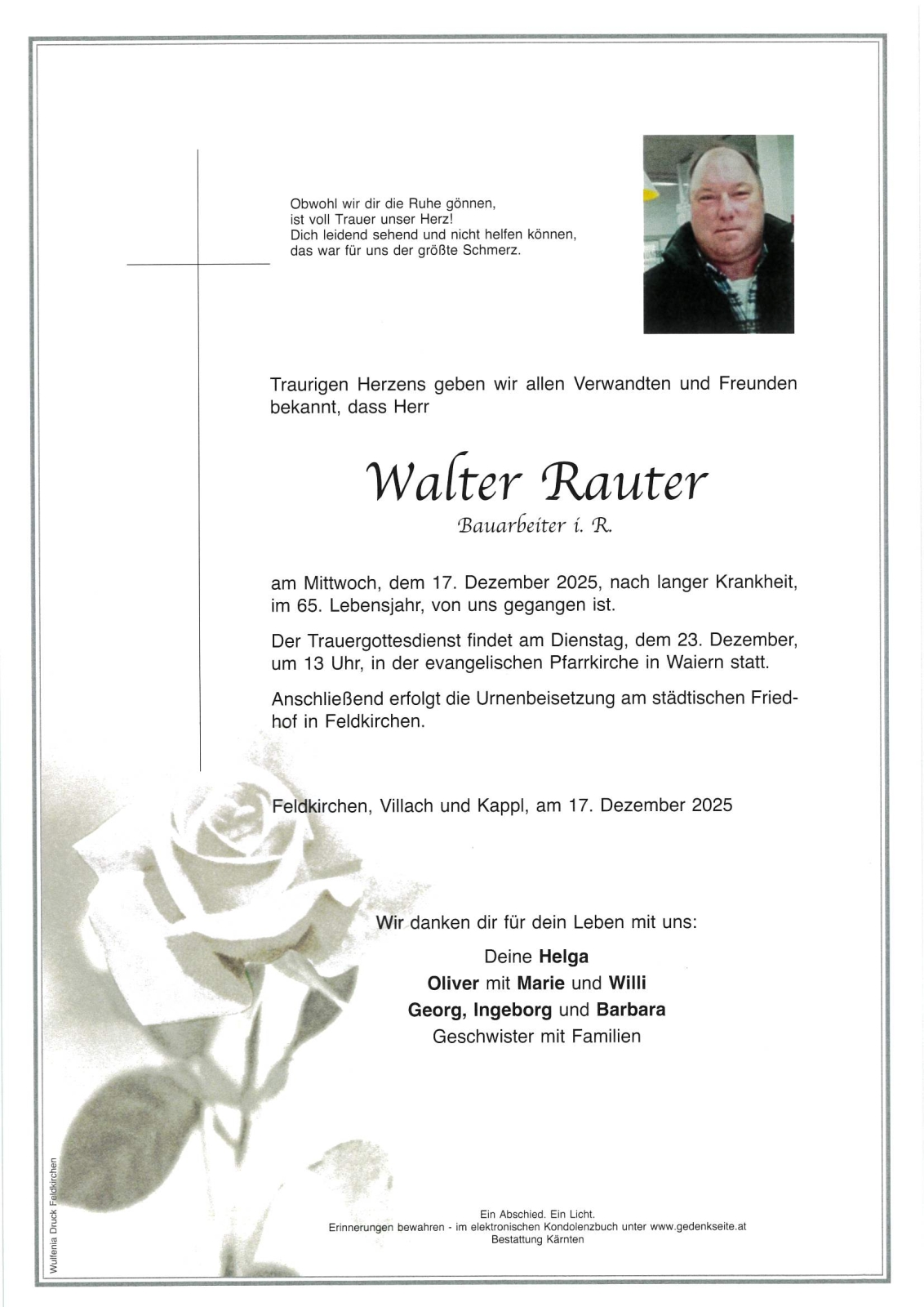 Verschicken Sie eine private Nachricht an die Familie & Hinterbliebenen von Walter Rauter. Diese wird nicht veröffentlicht, sondern landet direkt im E-Mail-Postfach der Administrator:innen dieser persönlichen Gedenkseite.