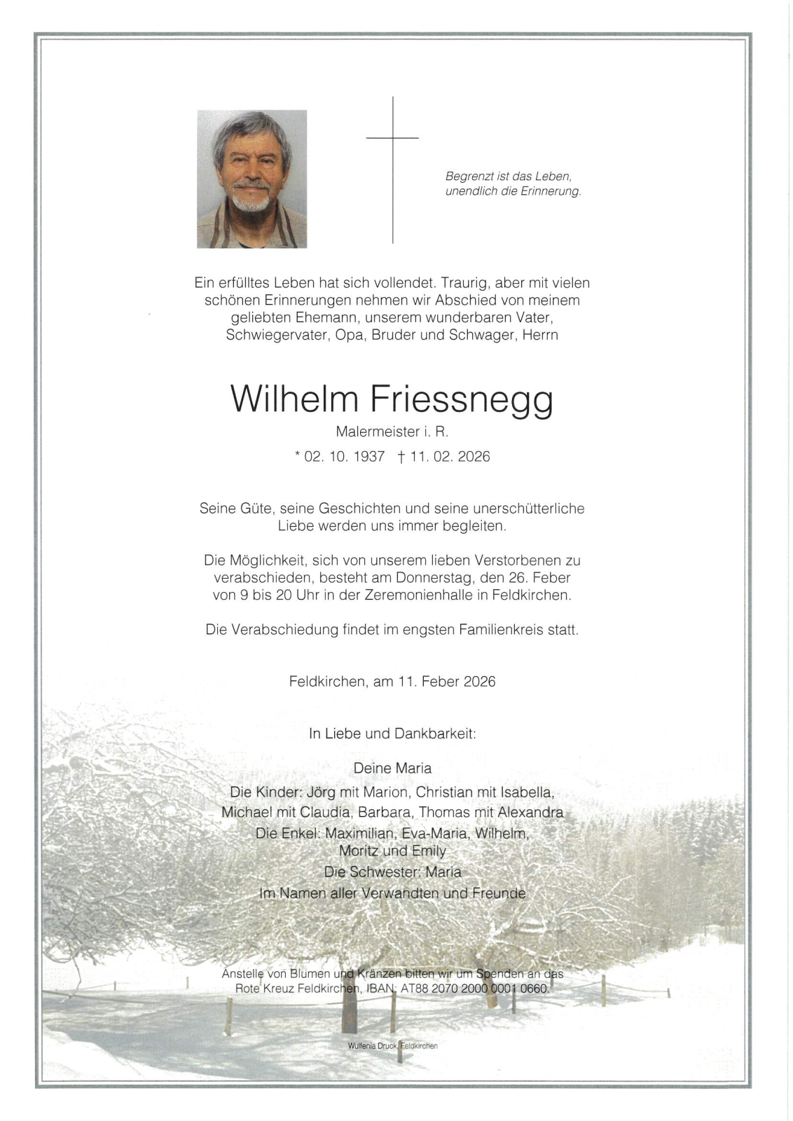 Verschicken Sie eine private Nachricht an die Familie & Hinterbliebenen von Wilhelm Friessnegg. Diese wird nicht veröffentlicht, sondern landet direkt im E-Mail-Postfach der Administrator:innen dieser persönlichen Gedenkseite.