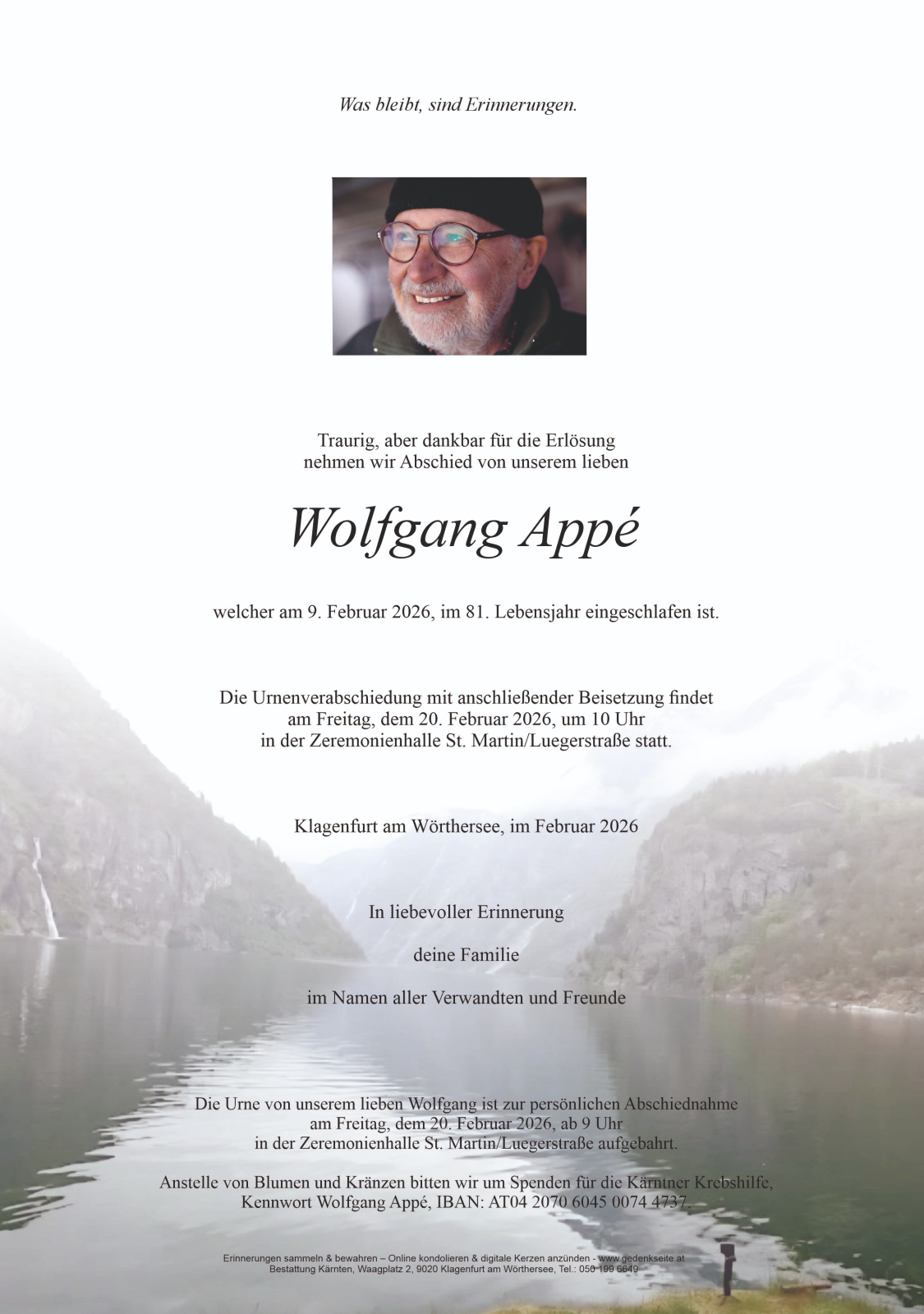 Trauerfeier am 20. Februar 2026 um 10:00 Uhr,