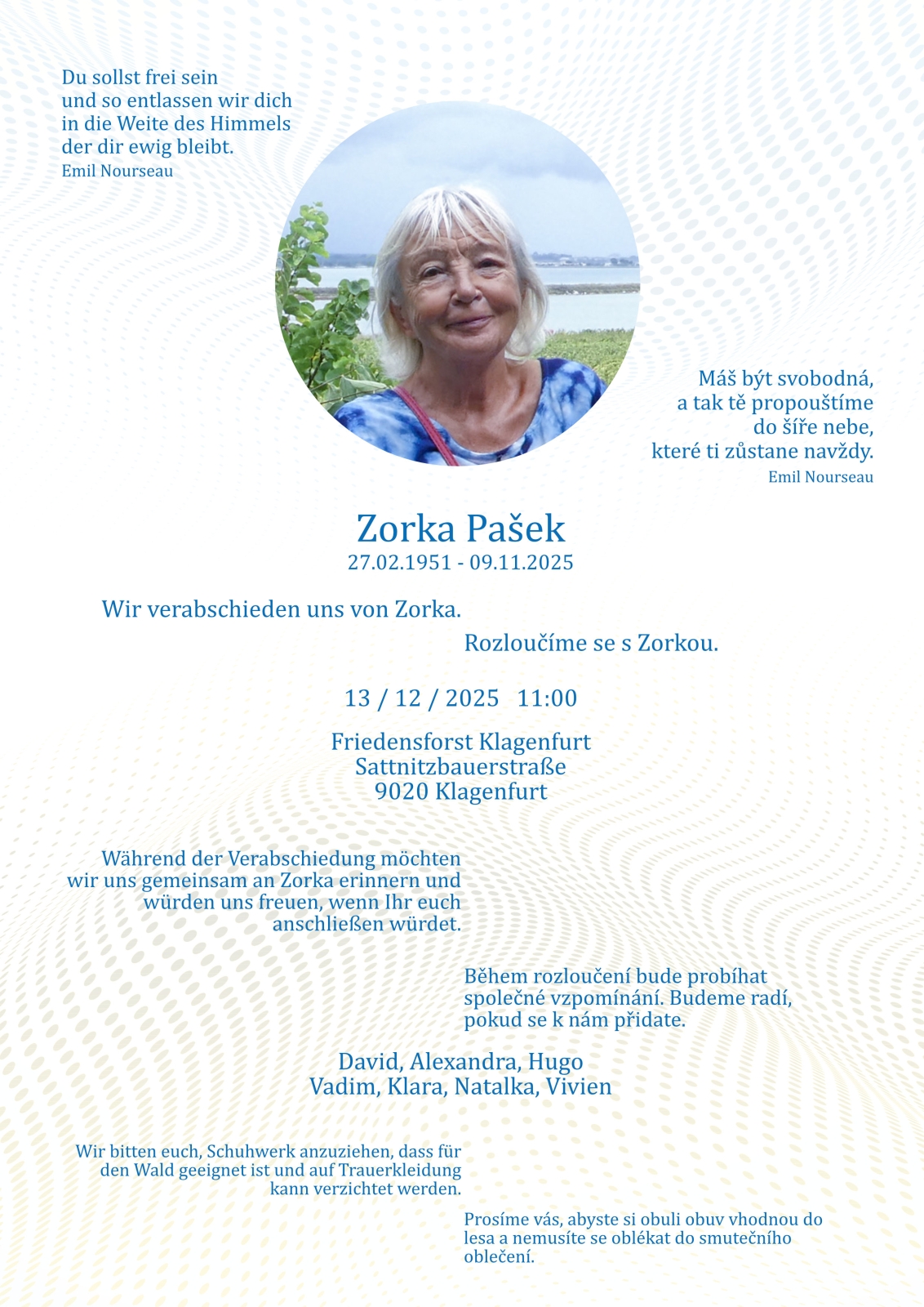 Verschicken Sie eine private Nachricht an die Familie & Hinterbliebenen von Zorka Pašek. Diese wird nicht veröffentlicht, sondern landet direkt im E-Mail-Postfach der Administrator:innen dieser persönlichen Gedenkseite.