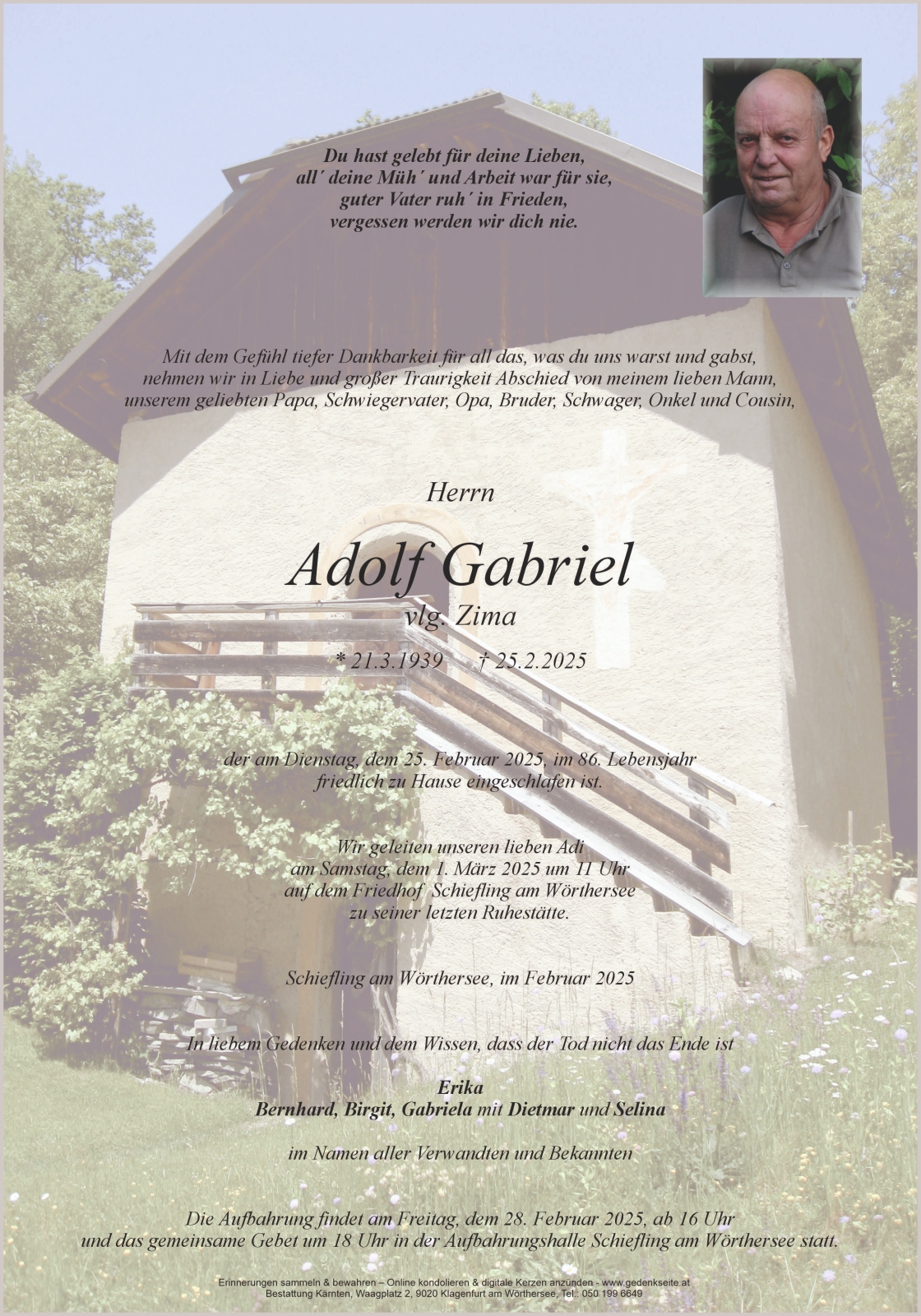 Verschicken Sie eine private Nachricht an die Familie & Hinterbliebenen von Adolf Gabriel. Diese wird nicht veröffentlicht, sondern landet direkt im E-Mail-Postfach der Administrator:innen dieser persönlichen Gedenkseite.