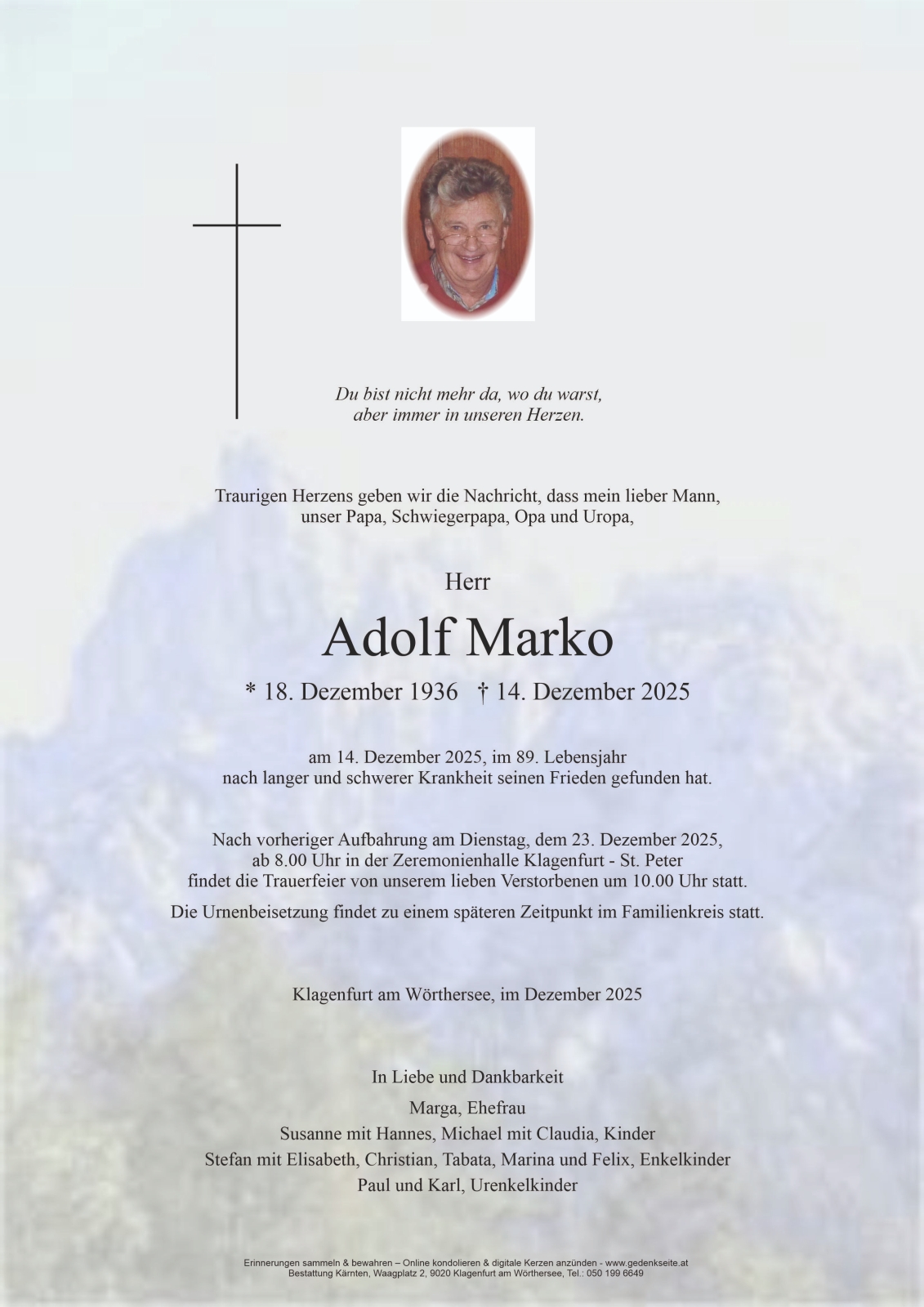 Verschicken Sie eine private Nachricht an die Familie & Hinterbliebenen von Adolf Marko. Diese wird nicht veröffentlicht, sondern landet direkt im E-Mail-Postfach der Administrator:innen dieser persönlichen Gedenkseite.