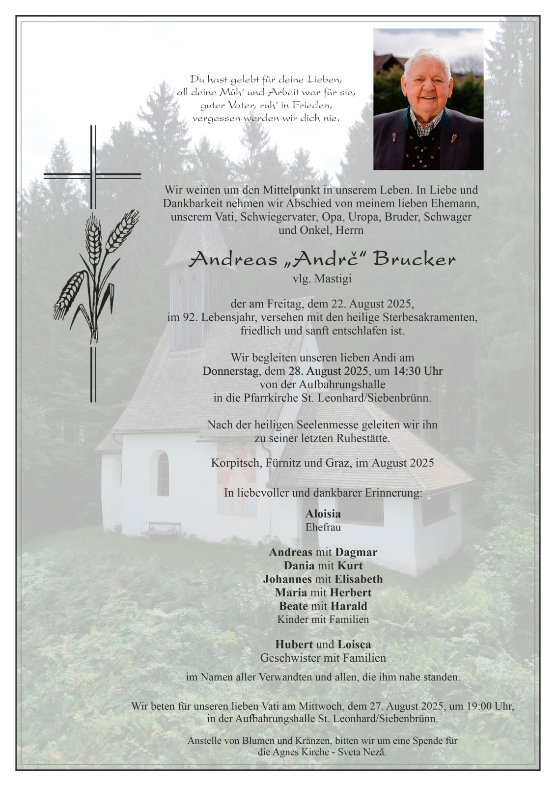 Verschicken Sie eine private Nachricht an die Familie & Hinterbliebenen von Andreas Brucker. Diese wird nicht veröffentlicht, sondern landet direkt im E-Mail-Postfach der Administrator:innen dieser persönlichen Gedenkseite.