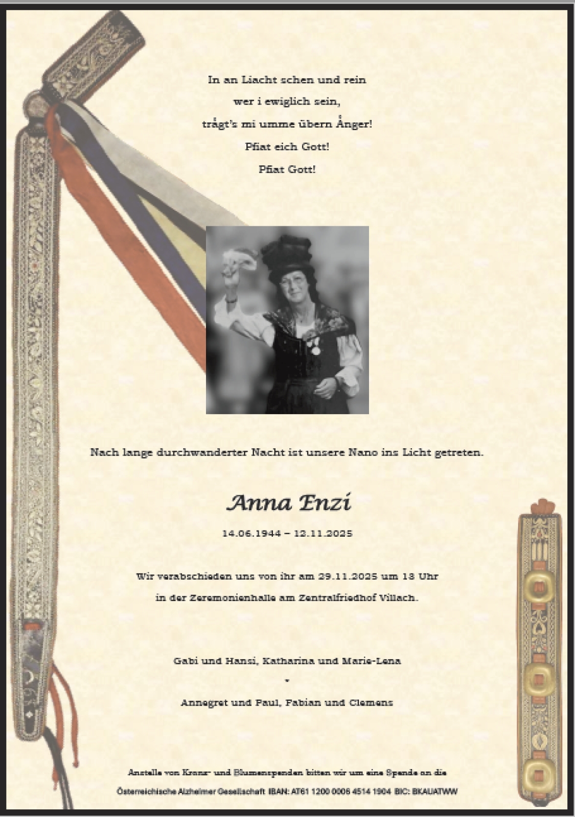 Verschicken Sie eine private Nachricht an die Familie & Hinterbliebenen von Anna Enzi. Diese wird nicht veröffentlicht, sondern landet direkt im E-Mail-Postfach der Administrator:innen dieser persönlichen Gedenkseite.