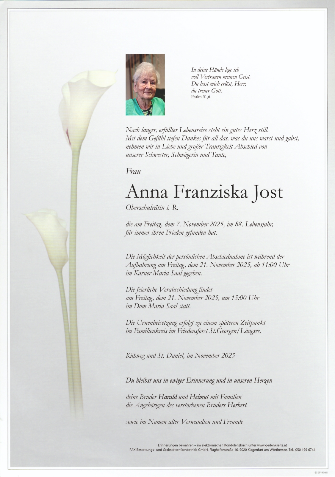 Trauerfeier am 21. November 2025 um 15:00 Uhr,